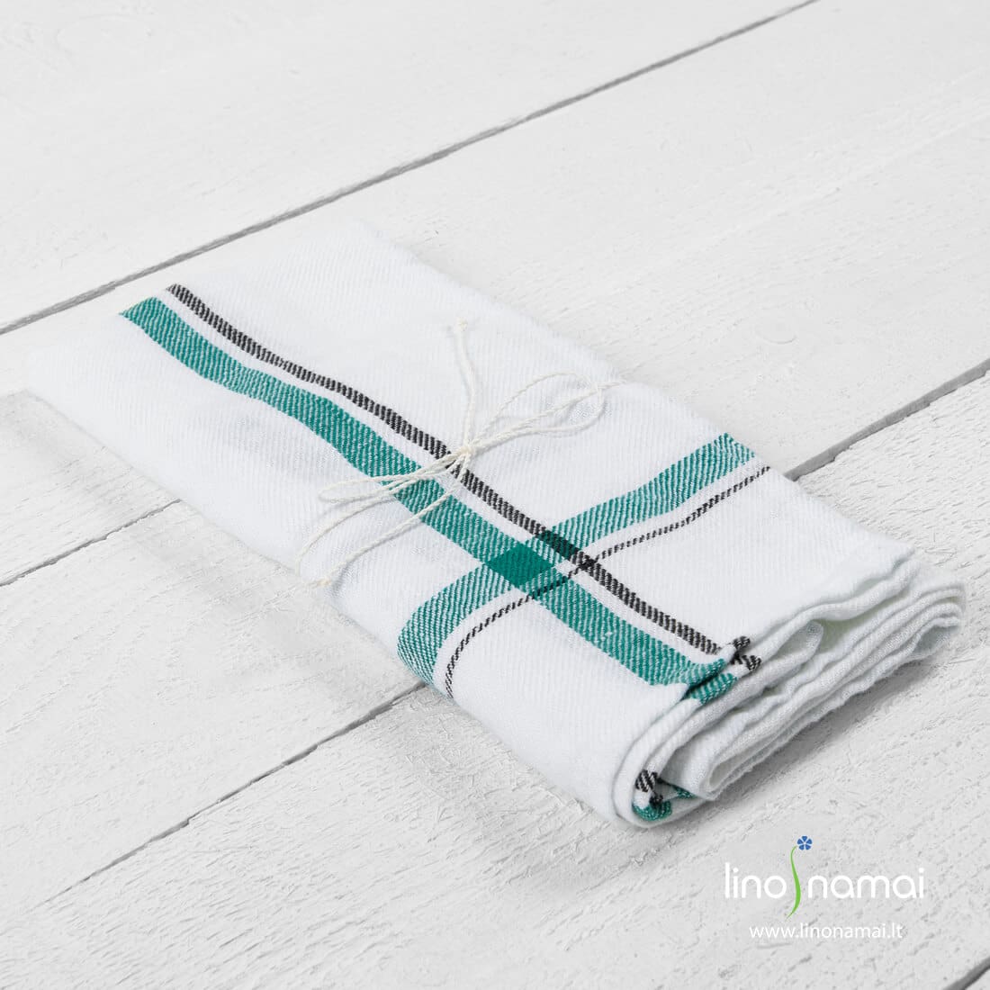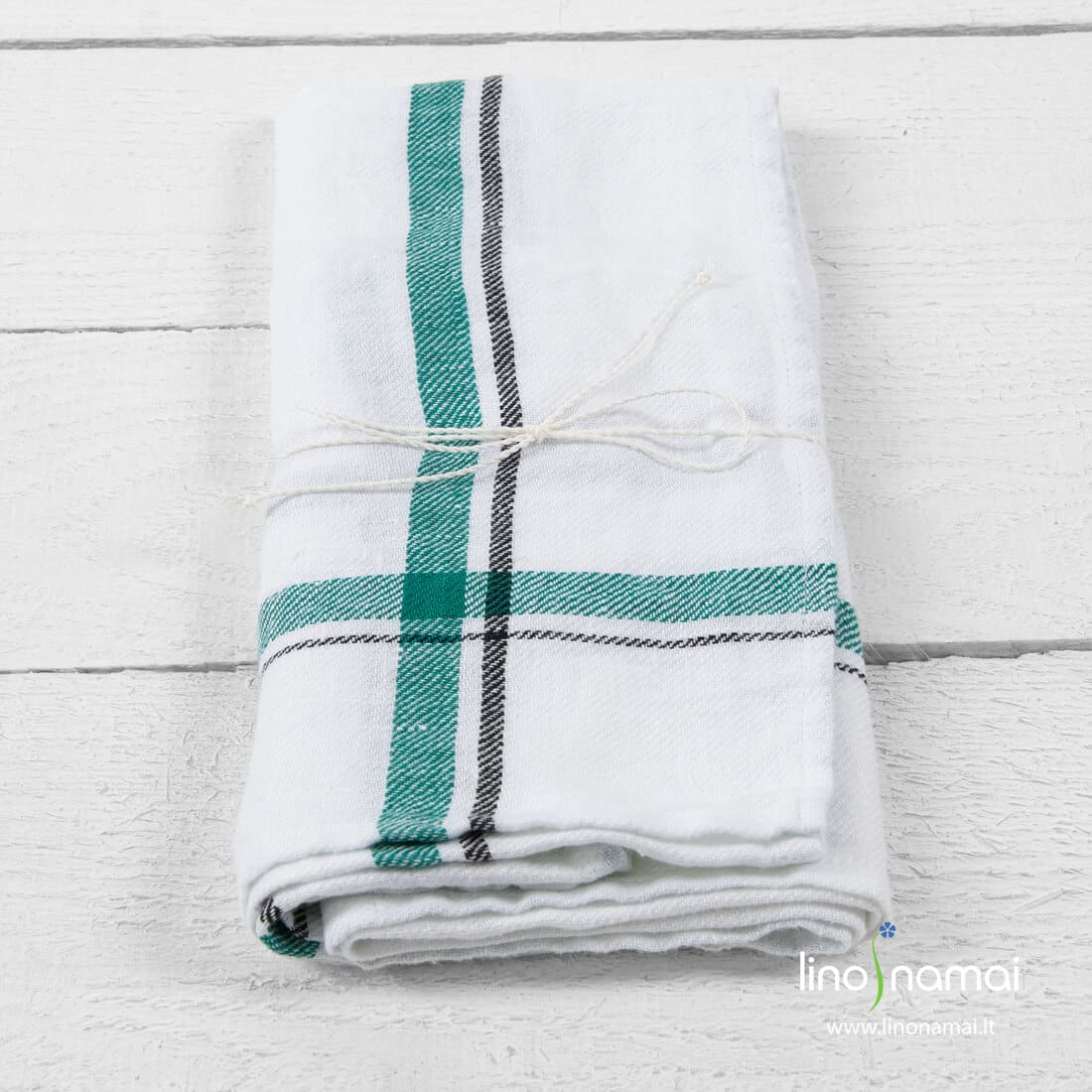 Lininis virtuvės rankšluostis žaliai languotas. Gaminio audinys - 100% linas, austas ruoželio raštu, naudoti ryškiai balti, juodi, žali verpalai. Specialus skalbimas padarė šį rankšluostuką labai minkštą, švelnų. Jis puikiai sugeria drėgmę, nereikalauja ypatingos priežiūros. Paruošta dovanoti - perrištas balta linine virvele.