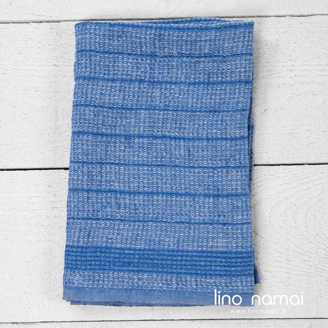 Lininis „vaflinis“ virtuvės rankšluostis. Gaminio audinyje suderinti mėlyni ir balti verpalai, išausti vertikalūs siauri dryžiai. Rankšluostis išskalbtas specialiu būdu, todėl minkštas, švelnus, puikiai sugeriantis drėgmę.