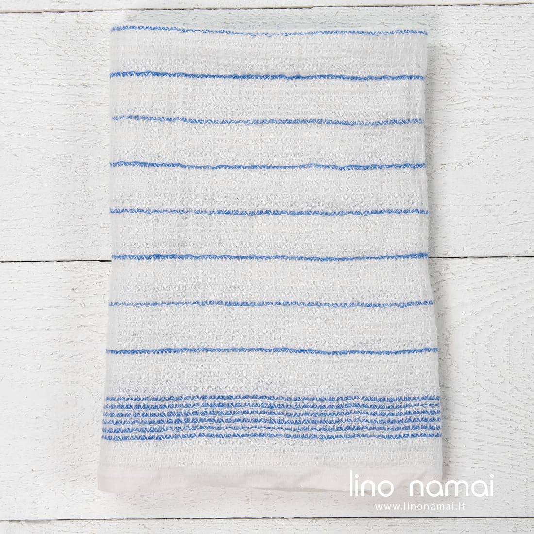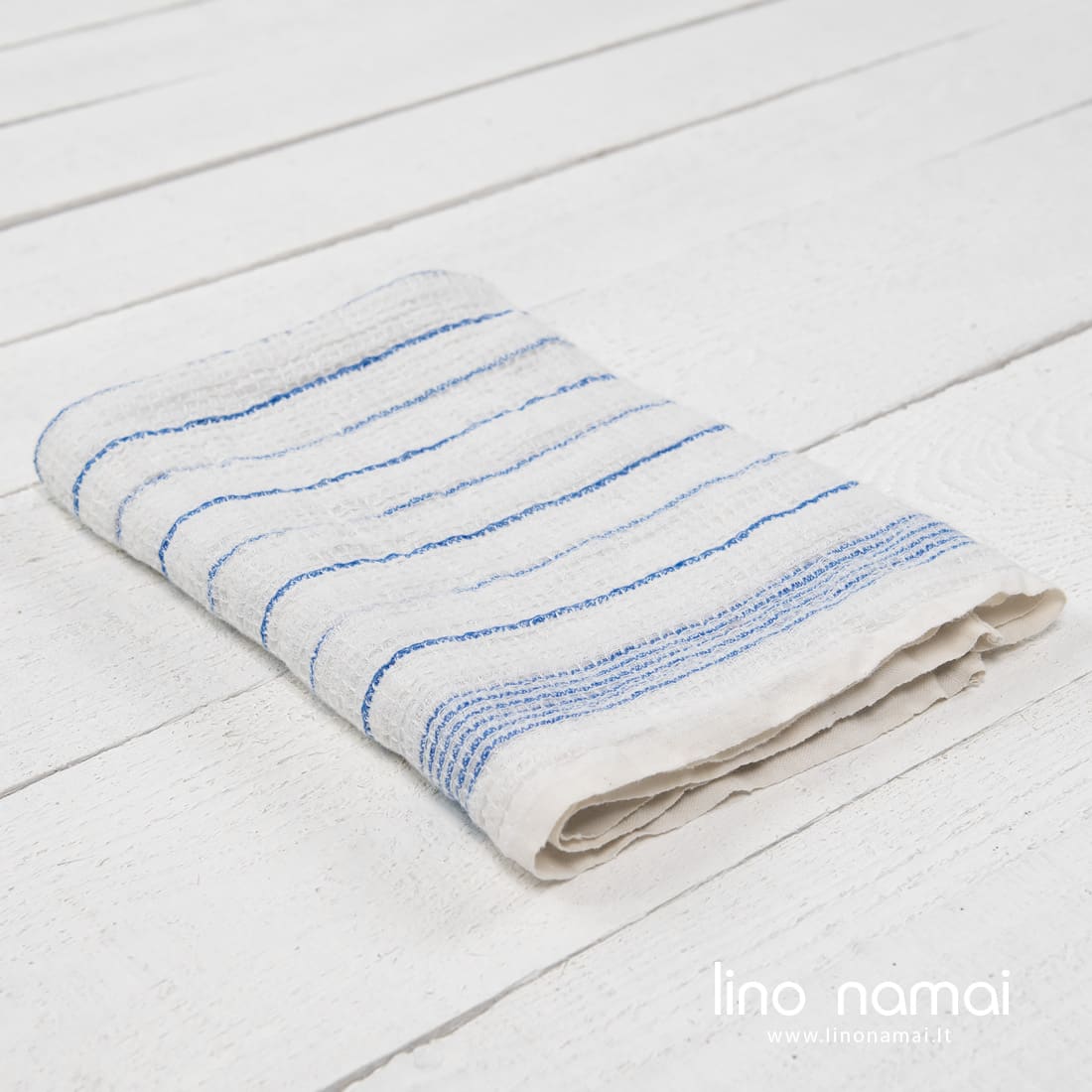 Lininis „vaflinis“ virtuvės rankšluostis su mėlynais siaurais dryžiais pieno baltumo (gelsvai baltame) fone. Tvirtas, tankus, patvarus linas buvo išskalbtas specialia technologija, kad suminkštėtų, puikiai sugertų drėgmę. Tokio audinio rankšluostuku malonu ir šluostytis rankas, ir sausinti indus, virtuvinius, stalo įrankius.