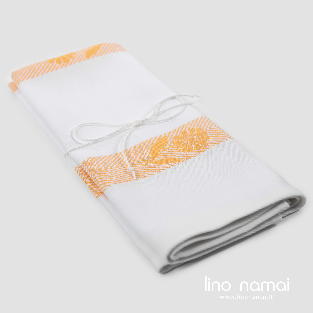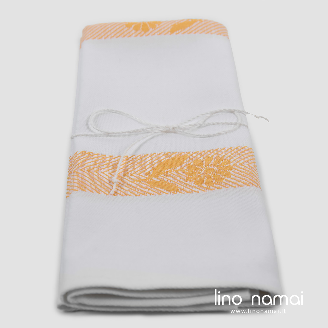 • Puslininis rankšluostis baltas su geltonom gėlėm; žakardas.