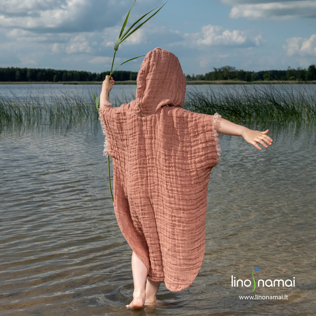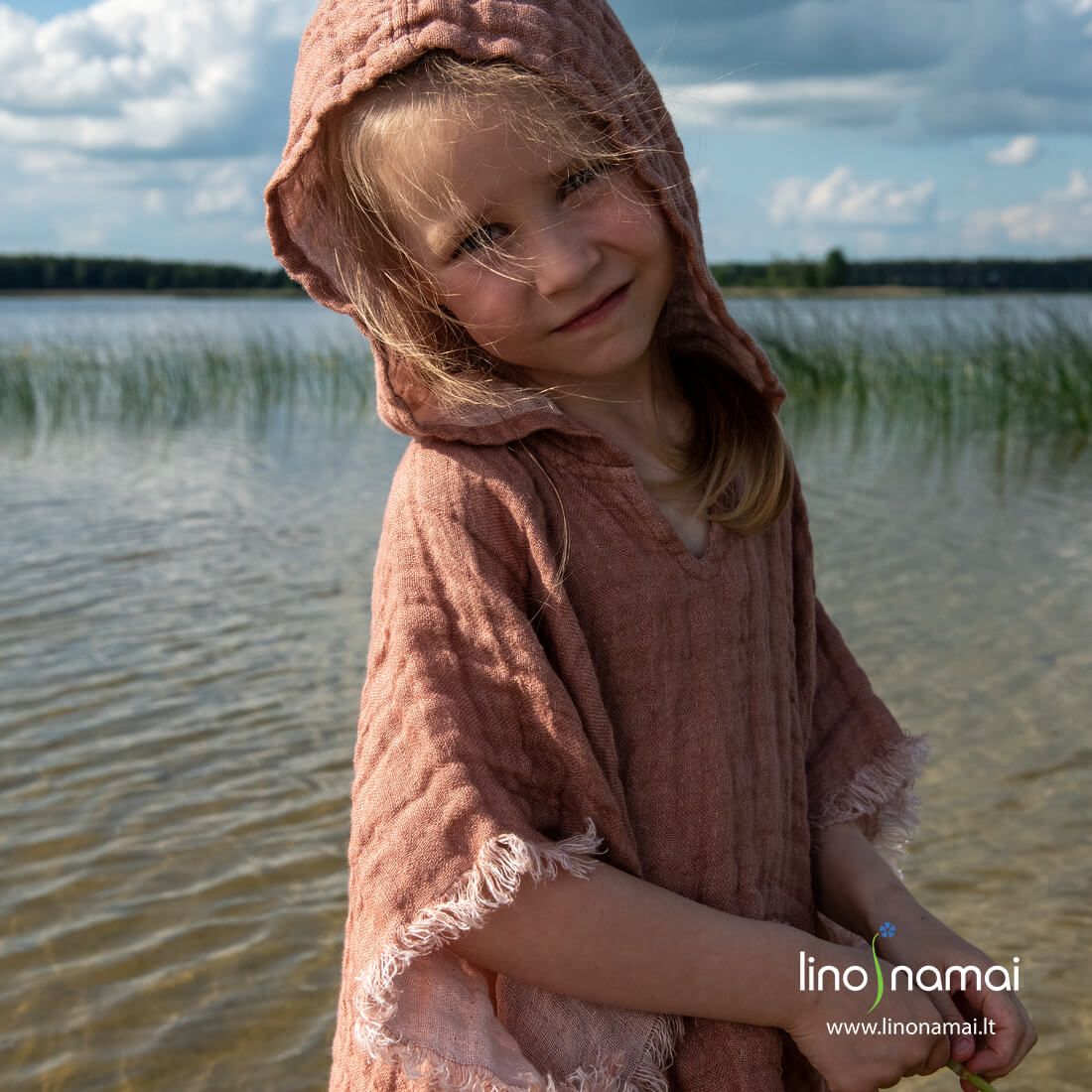 Rudas lininis vaikiškas pončas. Jo dvipusiame audinyje suaudėme šviesiai rudus ir švelniai rožinius verpalus. Pončas - pats tinkamiausias pasirinkimas paplūdimiui, ežero pakrantei: puikiai sugeria drėgmę (atstoja nuobodų šluostymąsi rankšluosčiu), minkštas, švelnus, specialiai skalbtas audinys jaukiai šildo, natūralus pluoštas leidžia odai kvėpuoti. Su gobtuvu ir didele kišene priekyje. Rankoves papuošėme pešiotais kutais. Lengvas ir platus drabužis nevaržys vaiko judesių, ilgesnė nugaros dalis leis patogiai prisėsti ant smėlio, žolės. Vienas gaminys, o šitiek daug privalumų - verta įsigyti vasaros atostogoms!