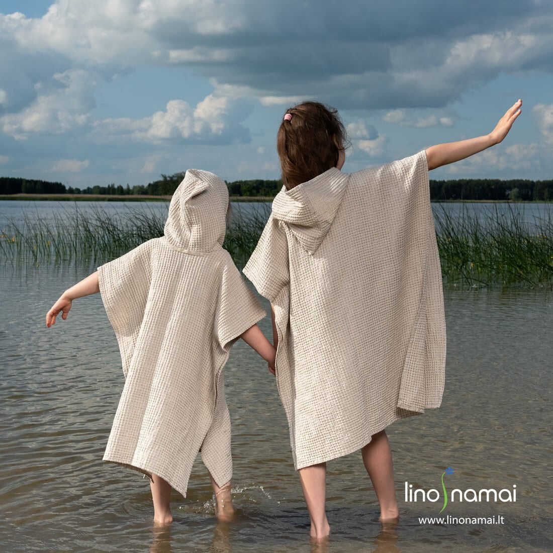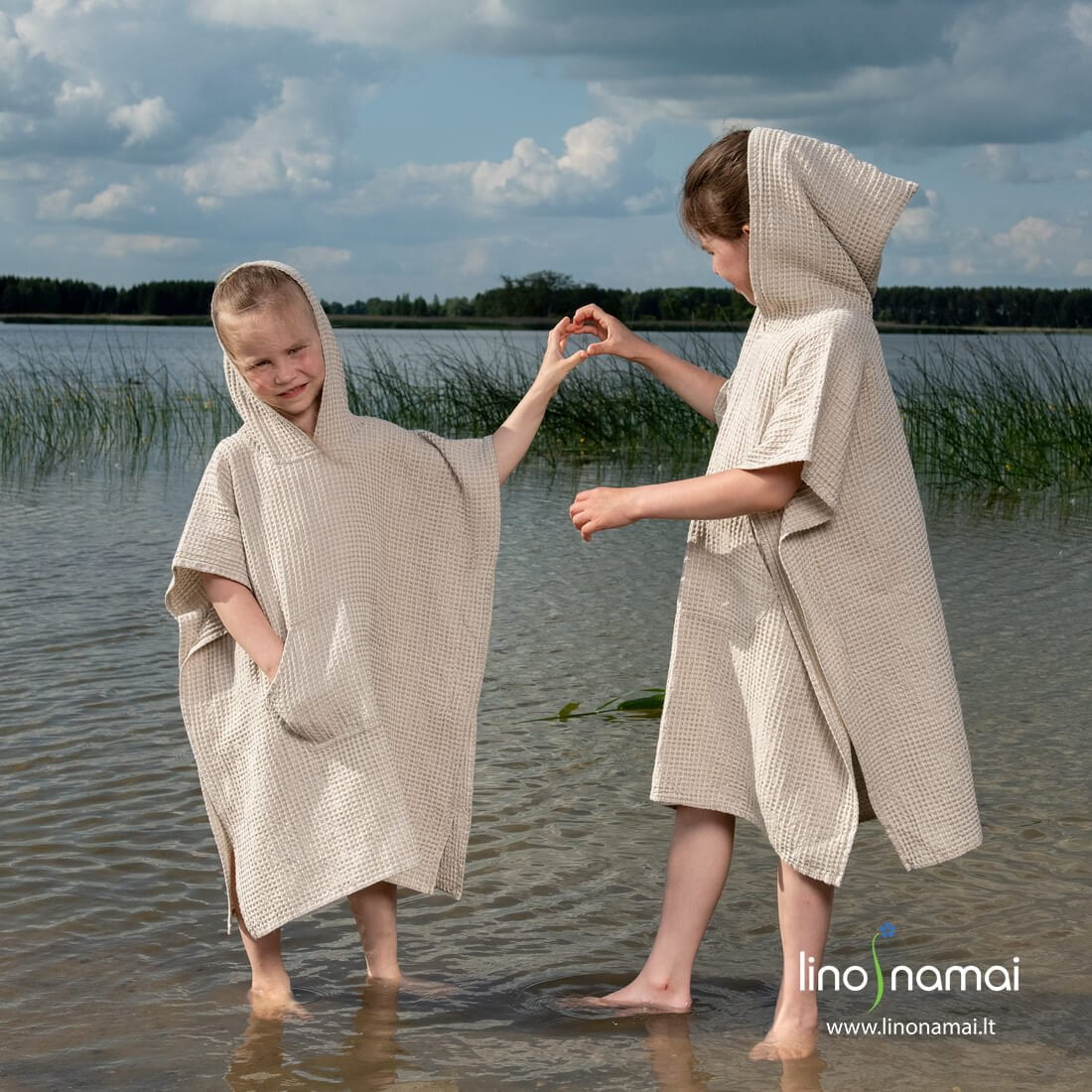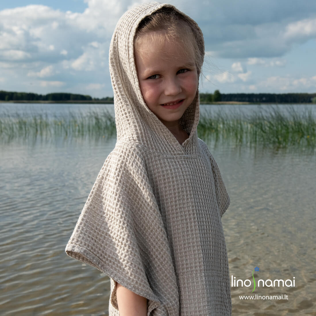 Šviesiai pilkas puslininis vaikiškas pončas dideliais „vafliniais“ langeliais. Gaminio audinyje suaudėme natūralios spalvos (nedažytus, rusvai pilkus) lino ir baltus medvilnės verpalus. Jei ieškote vaikams natūralaus pluošto, gerai sugeriančio drėgmę ir greitai džiūstančio drabužio su gobtuvu paplūdimiui, šis pončas - puikus pasirinkimas. Minkštas, švelnus, draugiškas odai, nes pasiūtas iš specialiai skalbto audinio. Jūsų vaikui nuobodu šildytis po maudynių susisupus į rankšluostį, norisi eiti tyrinėti aplinkinio pasaulio? Puiku! Aprenkite šį pončą ir pirmyn į smagius atradimus! Kūno nusausinimu, sušildymu, šlapių plaukučių pridengimu tuo tarpu nepastebimai pasirūpins šis paplūdimio drabužis.