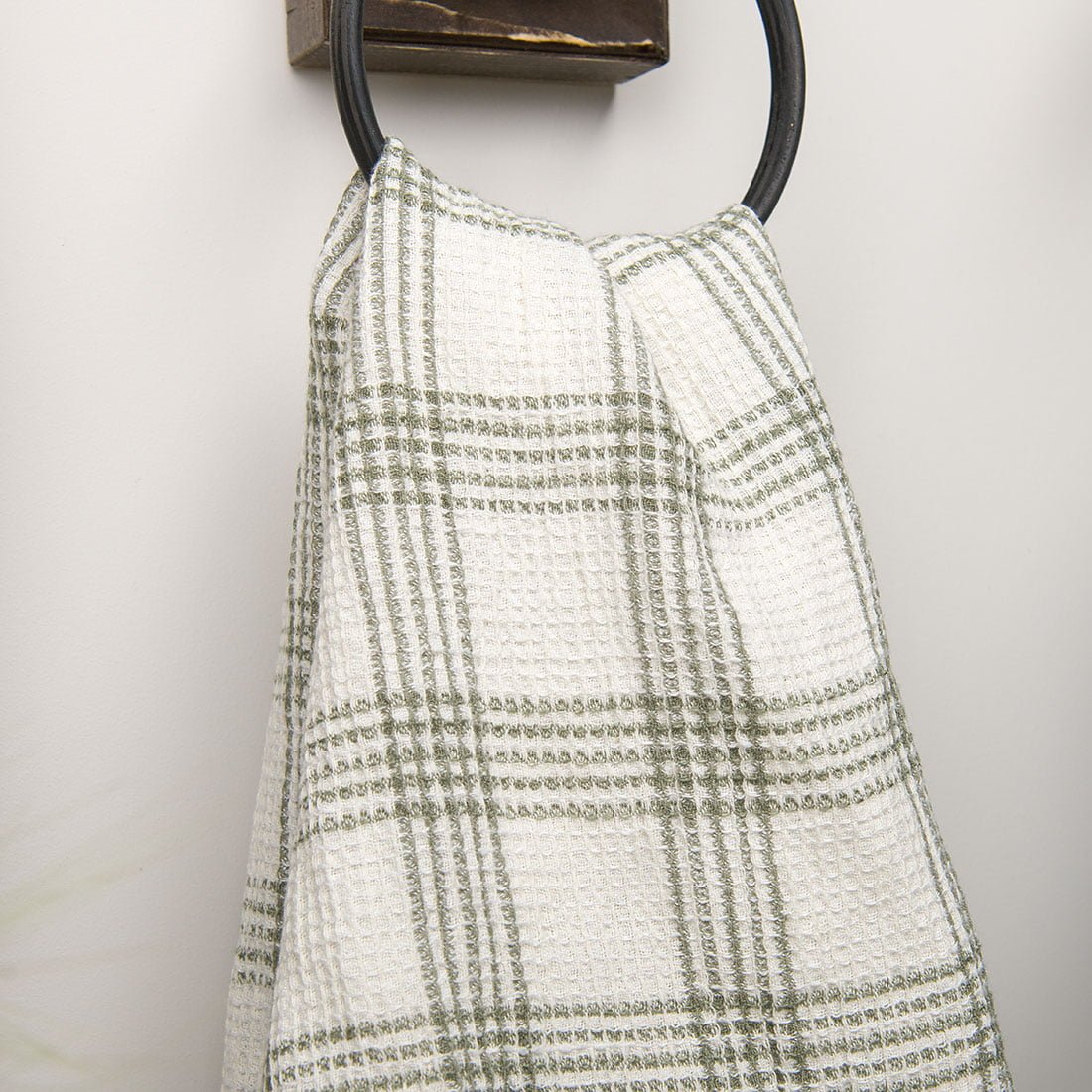 Puslininis pieno baltumo vonios rankšluostis su vertikaliomis ir horizontaliomis žalsvai pilkomis juostelėmis, sudarančiomis langelius. Lengvas, plonas ir tankus, gerai sugeriantis drėgmę, švelniai masažuojantis, greitai džiūstantis, malonus liesti. Su kilpute pakabinimui. Dailus languotas ''vaflinio'' rašto rankšluostis tinkamas naudoti vonioje ir pirtyje.