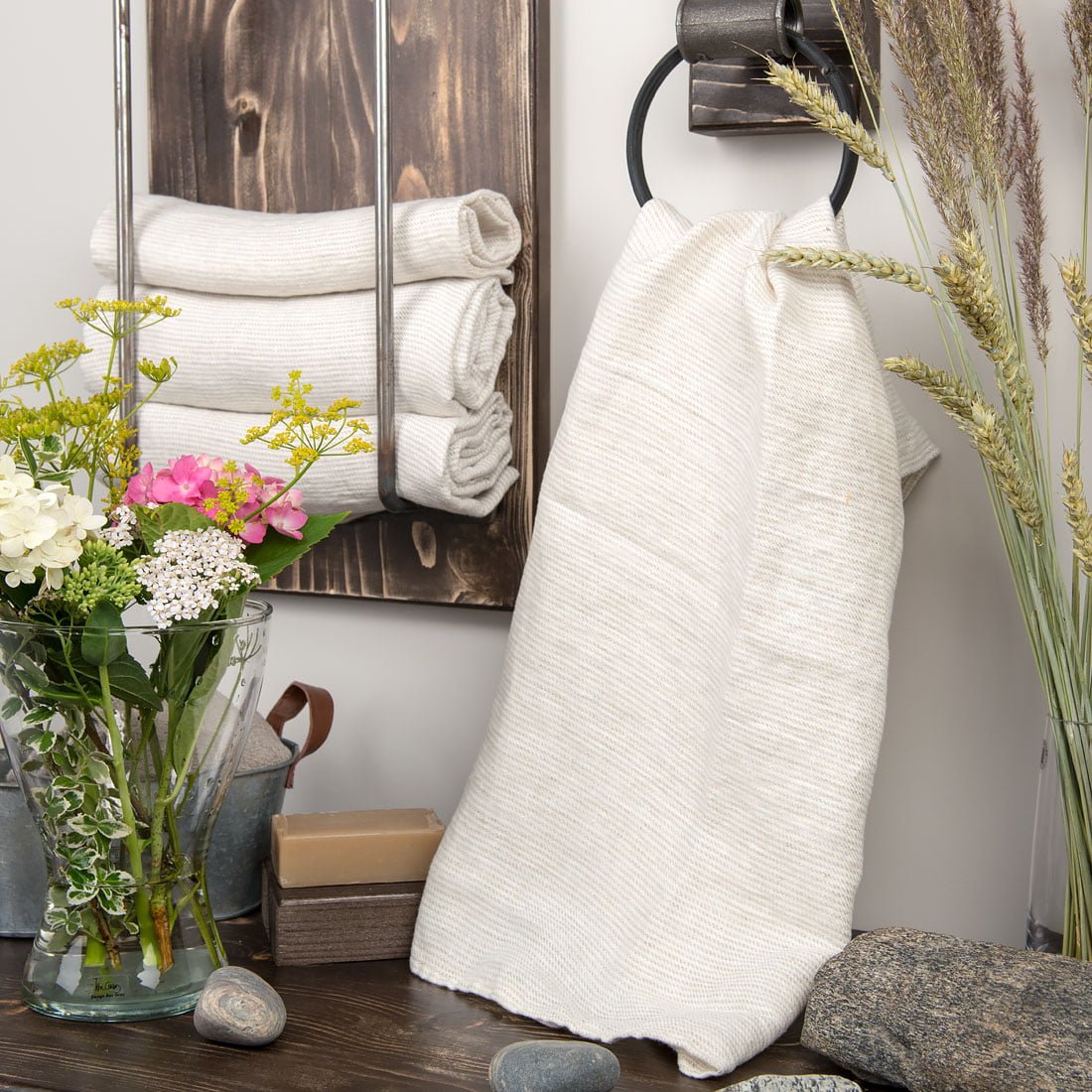 Baltas lininis vonios rankšluostis su šviesiai pilkais dryžiais. Kad taptų minkštas ir švelnus, buvo išskalbtas pramoniniu būdu. Visi keturi kraštai apsiūti. Natūralaus lino gaminiai ypač vertinami, nes jie gerai sugeria vandenį ir greitai džiūsta.