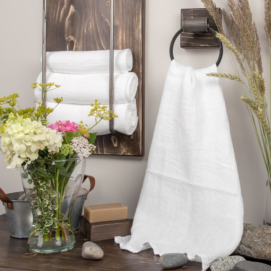 Ryškiai baltos spalvos gryno lino rankšluostis voniai ir pirčiai. Pasiūtas iš minkšto, tvirto, gerai drėgmę sugeriančio „vaflinio“ rašto audinio.
