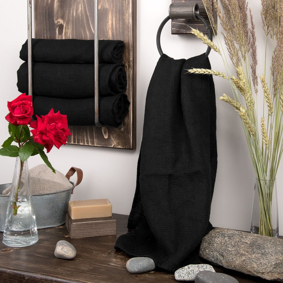 Lininis juodos spalvos skalbtas rankšluostis. Puikios kokybės, lengvas, plonas ir tankus rankšluostis gerai sugeria drėgmę, greitai džiūsta, malonus liesti, su kilpute pakabinimui. ''Vaflinio'' rašto rankšluostis tinkamas naudoti vonioje ir pirtyje. Skalbti patartina su tamsios spalvos skalbiniais.