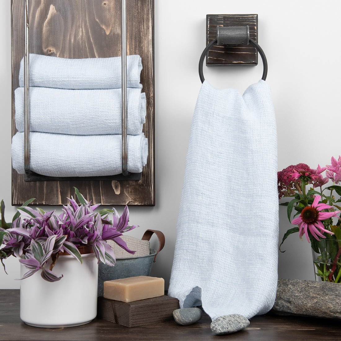 Melsvas lininis rankšluostis. Jo „vaflinis“ 100% lino audinys austas iš žydros ir baltos spalvos verpalų bei skalbtas specialiu būdu, kad gaminys būtų minkštas, švelnus, malonus odai. Mėgaukitės švelniu lino prisilietimu kasdien!