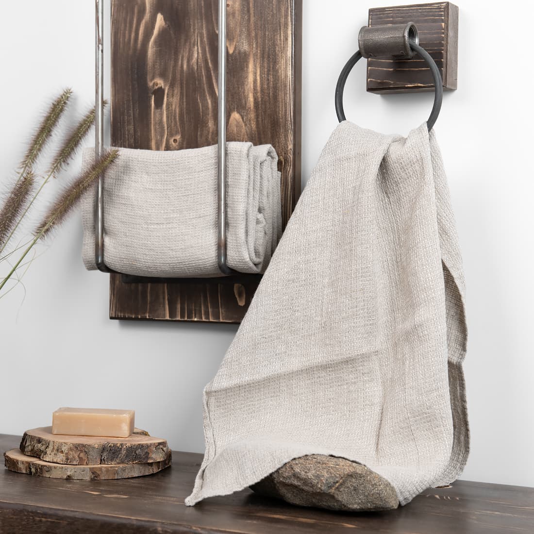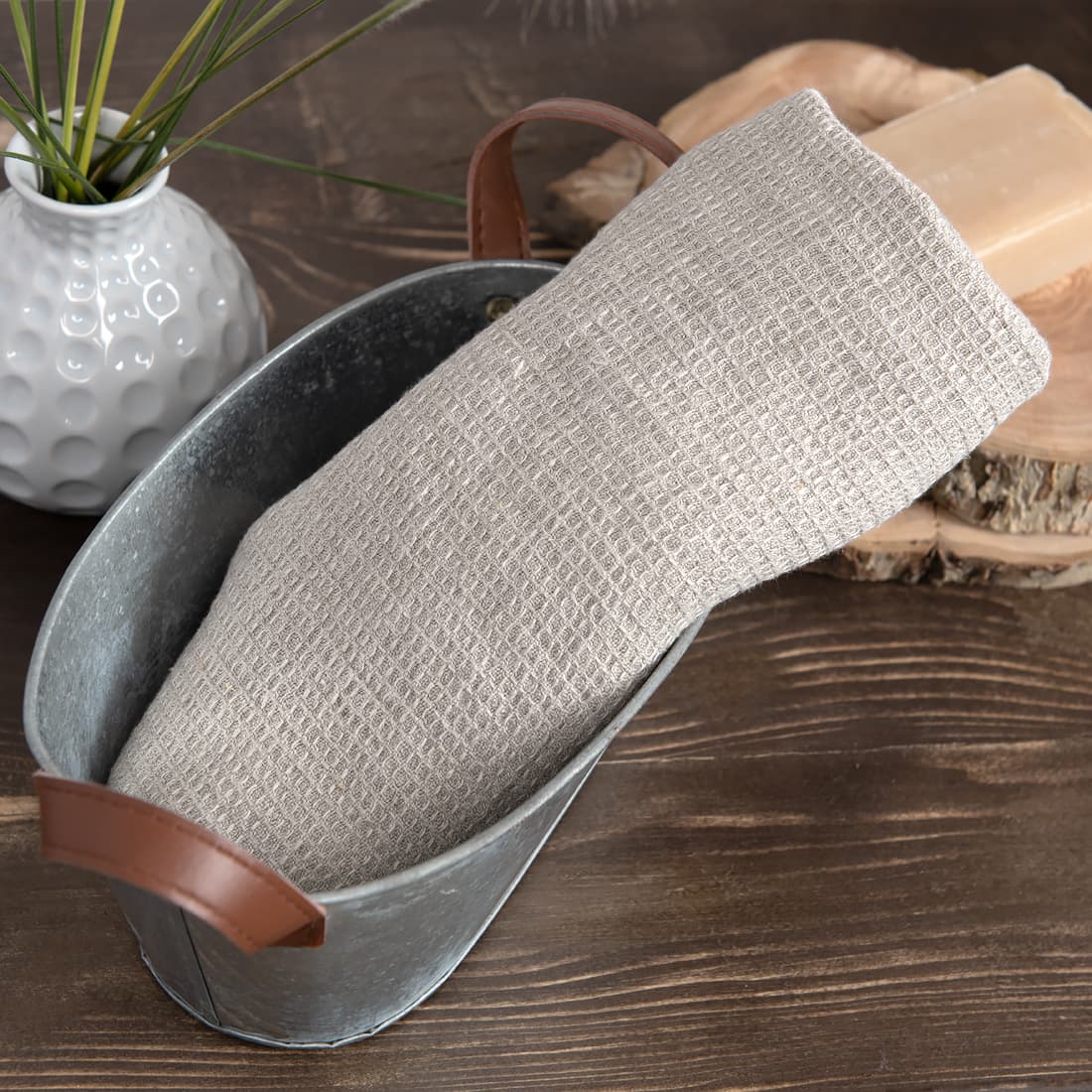 Rusvai pilkas (natūralios lino spalvos) gryno lino rankšluostis, pasiūtas iš patvaraus, minkšto, gerai drėgmę sugeriančio „vaflinio“ audinio. Puikus rankšluostis, tinkamas naudoti vonioje bei pirtyje.