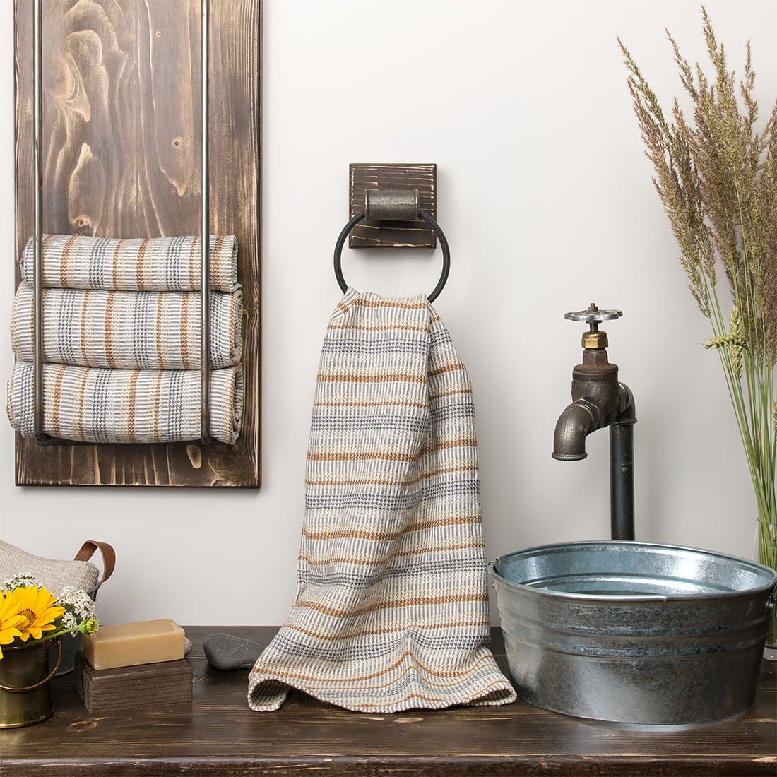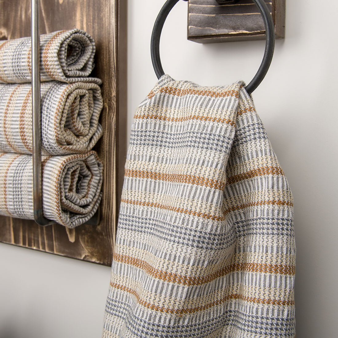 Šviesiai pilkas vonios rankšluostis austas pilkšvos, rudos ir rusvos spalvos dryžiais. Pasiūtas iš specialiai skalbto puslininio audinio. Turi patogią pakabinimo kilpelę. Švelnus odai ir gerai sugeriantis, tad taps nepamainomas po kasdienių maudynių.