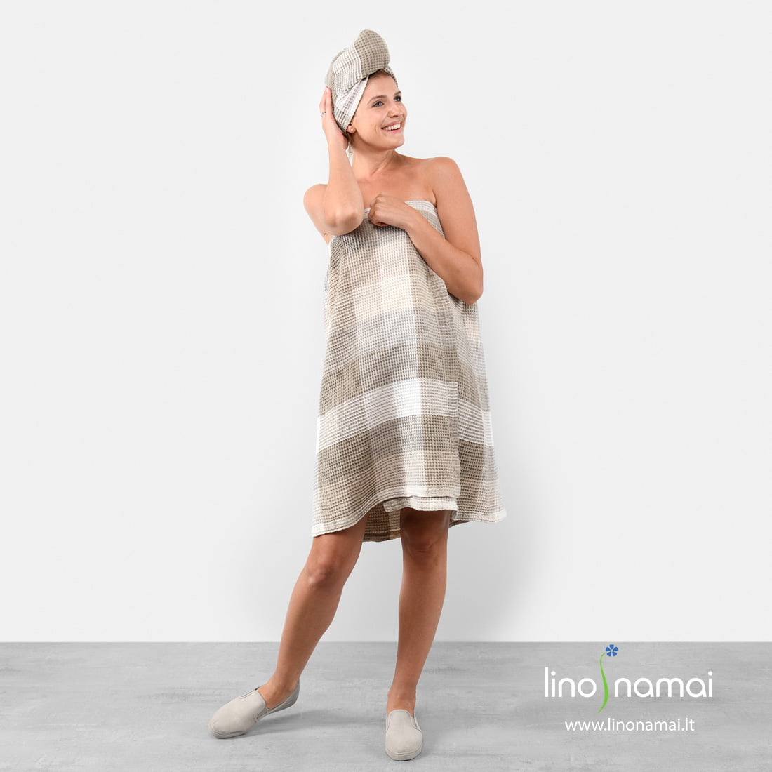 Puslininis rankšluostis pilkai languotas užsegamas saga. Puikiai sugeriantis drėgmę „vaflinis“ lino-medvilnės rankšluosčio audinys austas rusvai pilkais ir pieno baltumo (gelsvai baltais) langeliais, skalbtas specialiu būdu, kad būtų minkštas, švelnus, malonus odai. Gaminio nugaroje įverta plati guma tvirtai laiko rankšluostį vietoje, neleidžia jam nuslysti. Galima derinti su susegamu rankšluosčiu plaukams. Lankotės pirtyje ar mėgaujatės vonios malonumais namuose - šis rankšluostis kiekvieną kartą džiugins Jus savo minkštumu ir subtiliu grožiu.