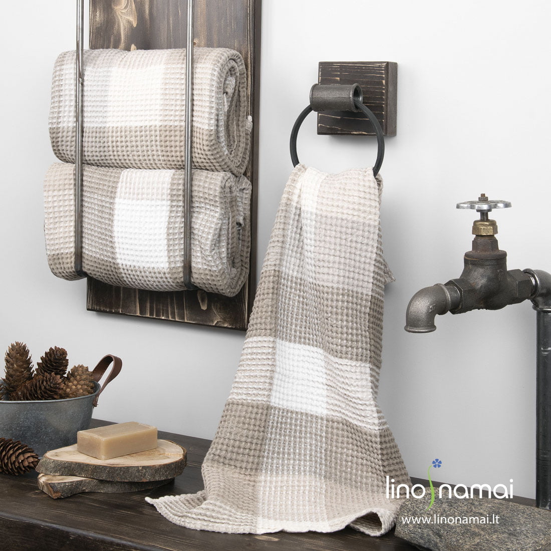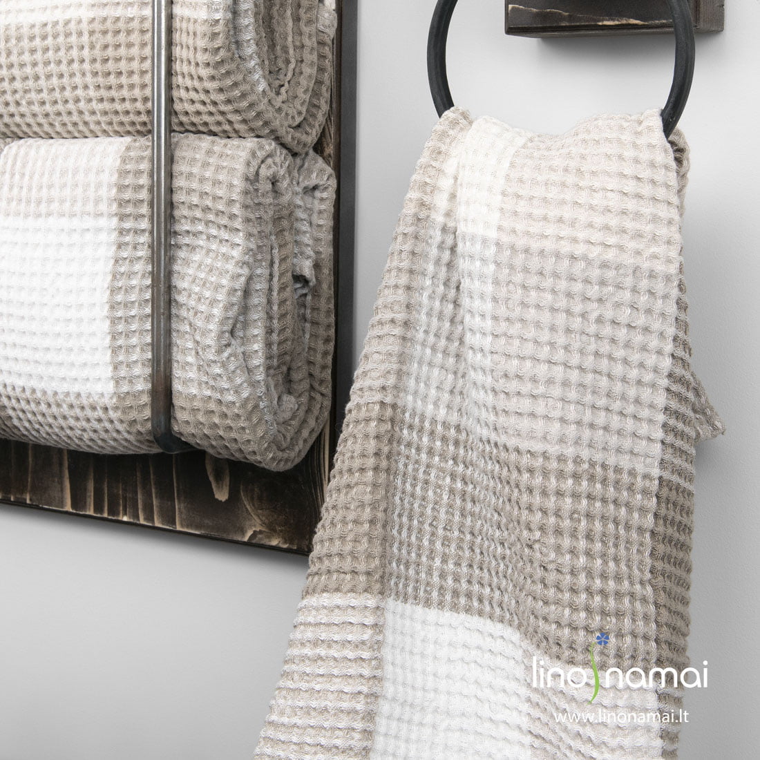 Puslininis rankšluostis smėlio spalvos langeliais, išaustais iš pieno baltumo (gelsvai baltų), rusvai pilkų ir šviesiai pilkų verpalų „vafliniu“ raštu. Audimo raštas suteikė purumo, o švelnumo ir minkštumo - specialus audinio skalbimas. Linas ir medvilnė puikiai sugeria drėgmę, todėl šis rankšluostis toks nepamainomas po vonios ar saunos. Turime jį dviejų dydžių. Derantys veido ir kūno rankšluosčiai vonios interjere sukurs gražia harmoniją, o Jūsų oda džiugins švelniu prisilietimu.
