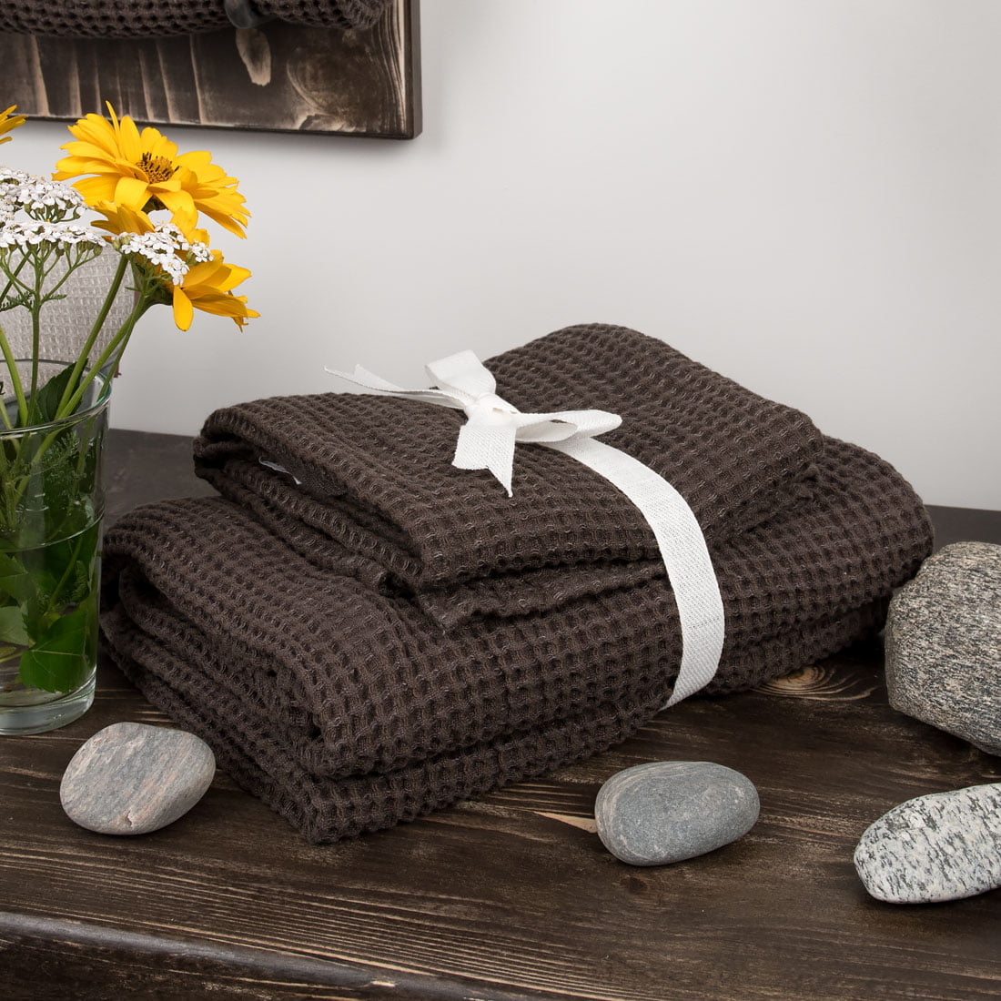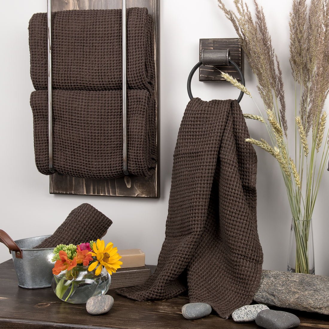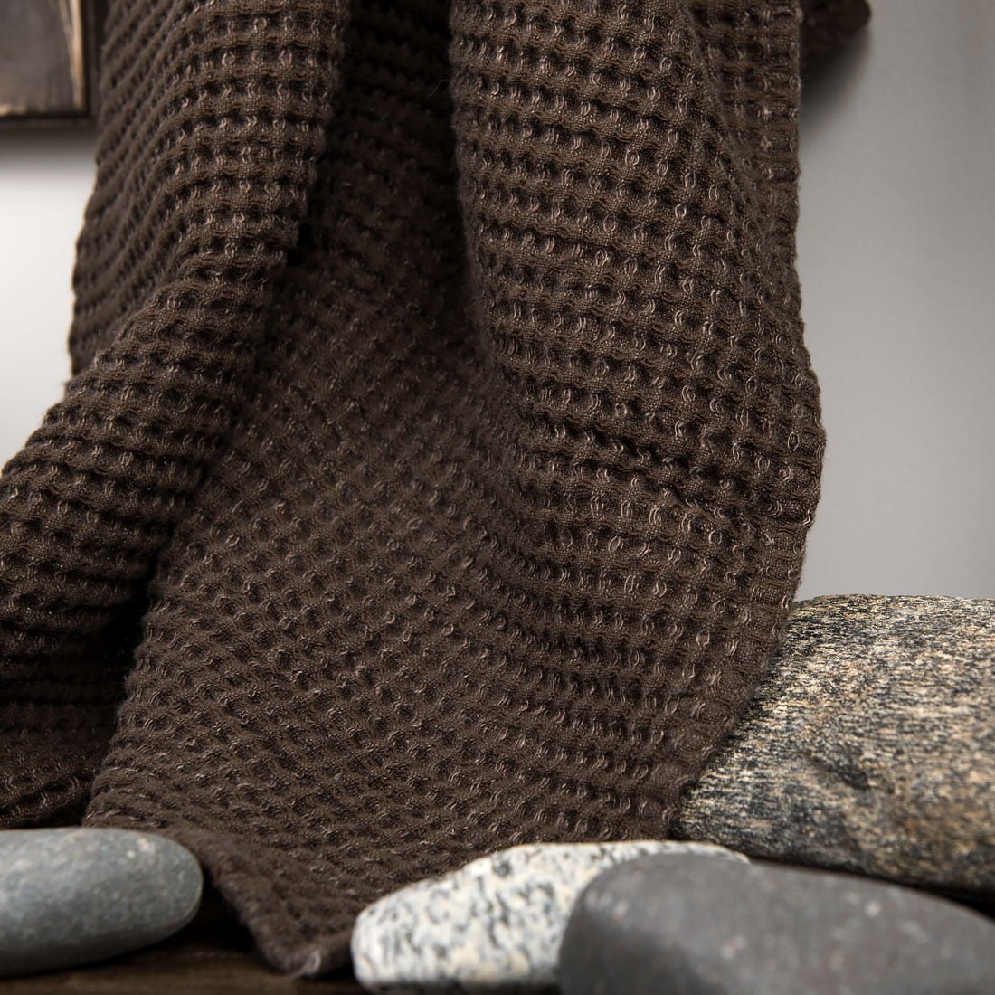 Tamsiai rudos spalvos vonios (pirties) rankšluostis iš specialia technologija skalbto ''vaflinio'' raštu austo lino / medvilnės sudėties audinio. Storas, tankus, gerai sugeriantis drėgmę, patvarus ir švelniai masažuojantis. Su kilpute pakabinimui.