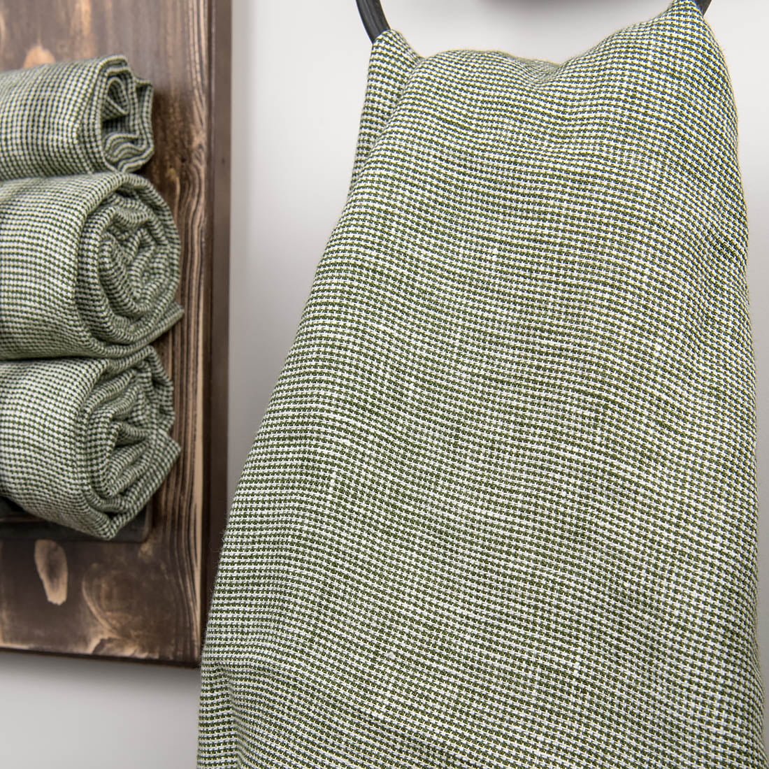 Natūralaus lino vonios rankšluostis žaliais (samaniniais) ir baltais langeliais. Pasiūtas iš specialiai skalbto lininio audinio, tad šis rankšluostis ypač patiks tiems, kurie vertina švelnumą, minkštumą. Šis originalaus audimo gaminys gali tapti įdomiu interjero akcentu Jūsų vonioje.