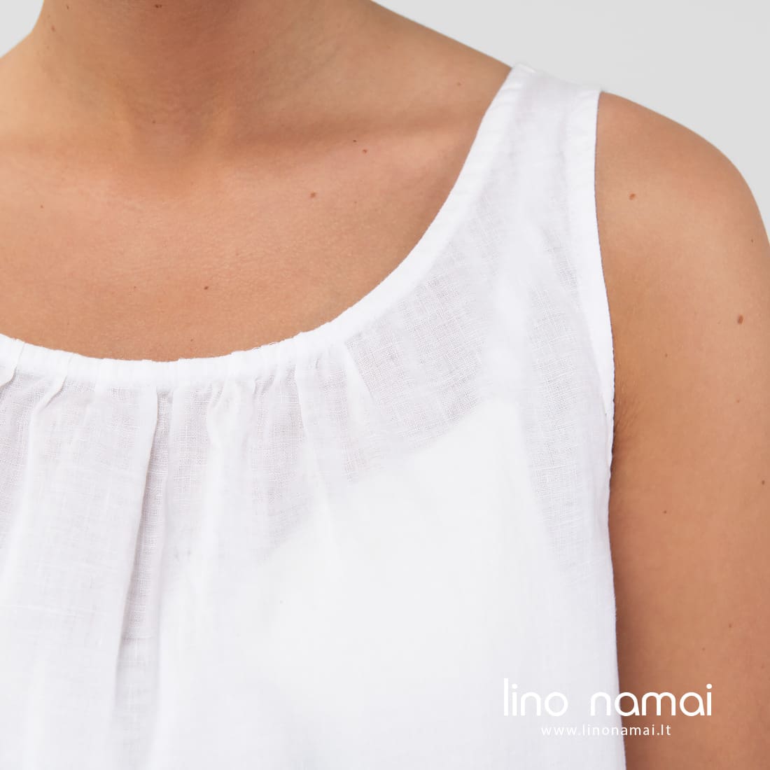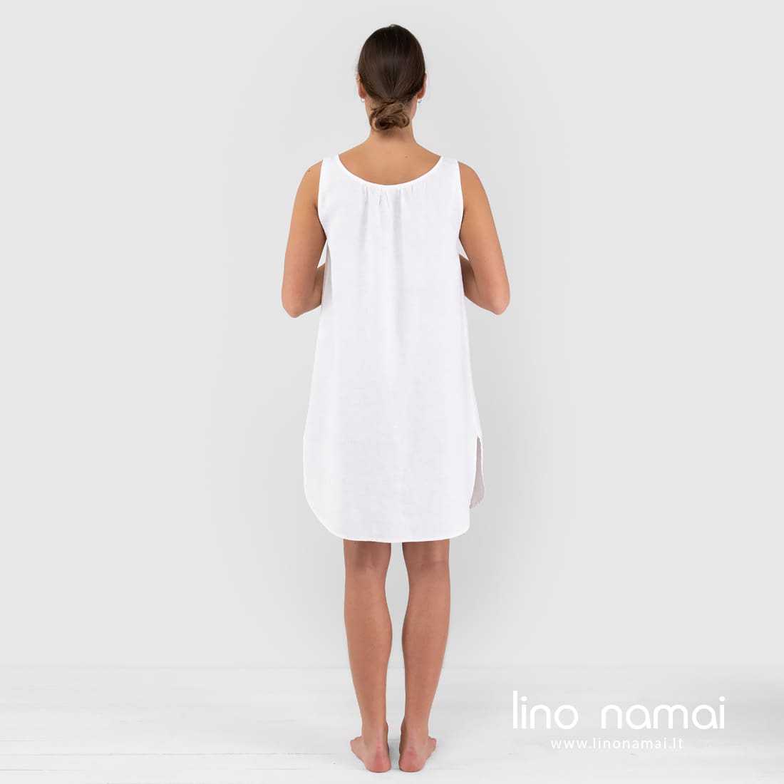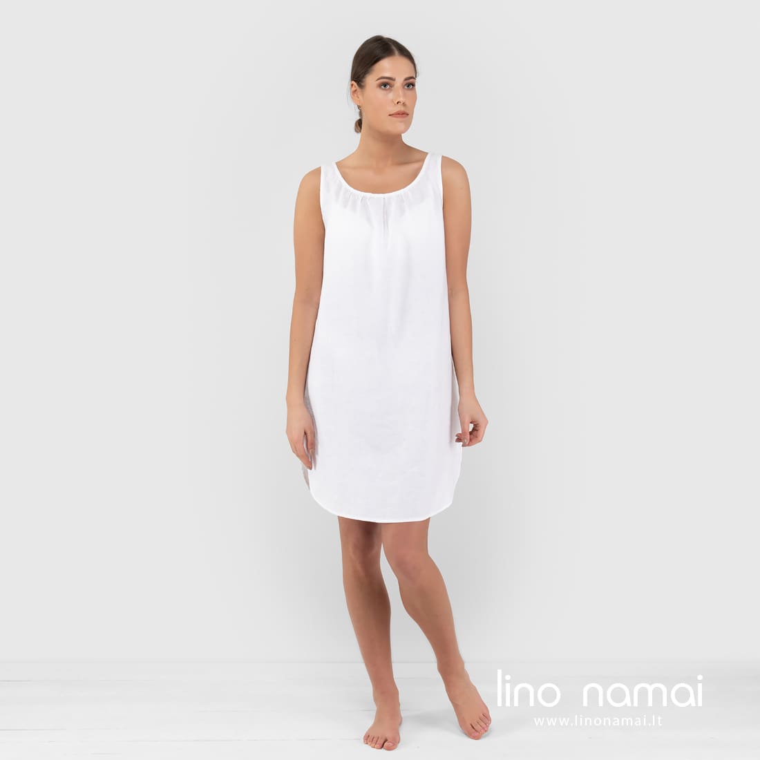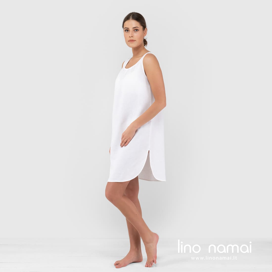 Naktinukai iš ryškiai balto lininio audinio. Lengvučiai berankoviai, puošti apvalintais skeltukais šonuose. Šių naktinių marškinių audinys skalbtas specialia technologija, kuri suteikė minkštumo ir švelnumo. Malonus, draugiškas odai audinys pagerins miego kokybę, leis mėgautis švelniu lino prisilietimu. Įsigykite vėsinančio lino miego drabužį karštoms vasaros naktims!