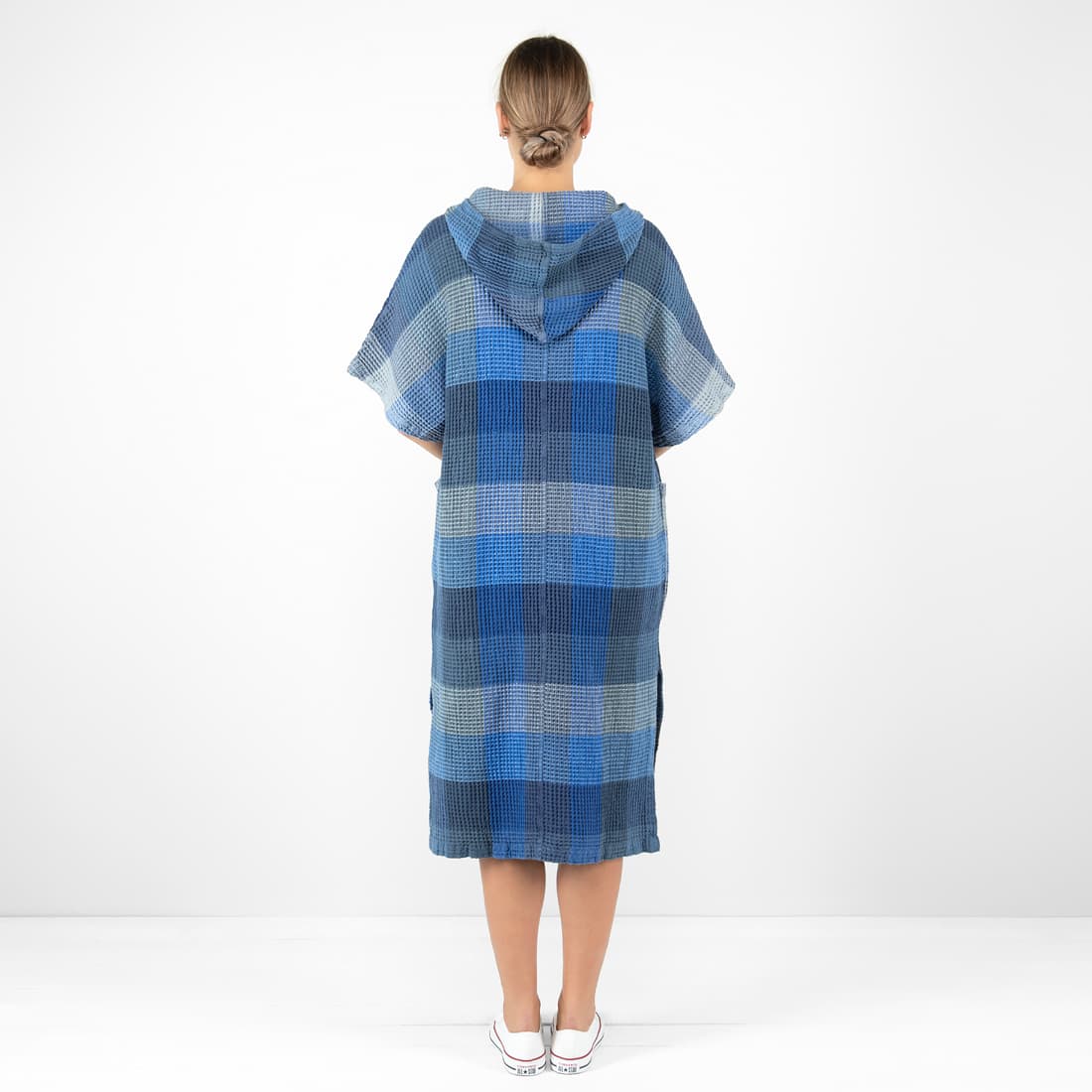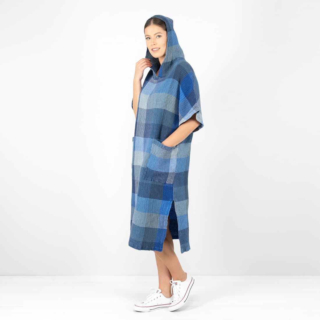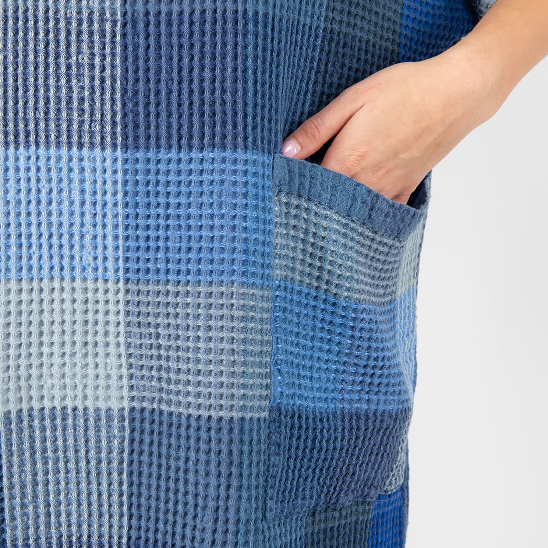 • BINGO mėlynas languotas „vaflinis“ pončas iš minkšto skalbto lino-medvilnės audinio