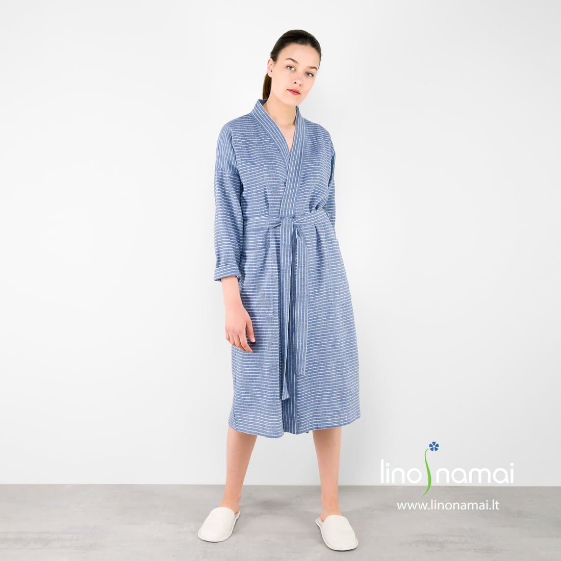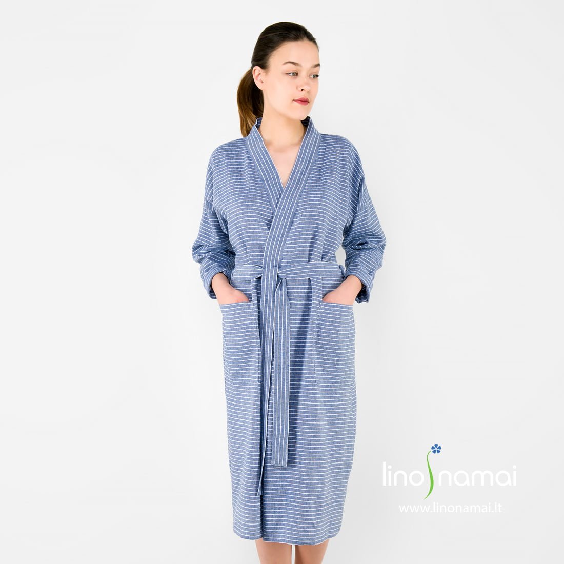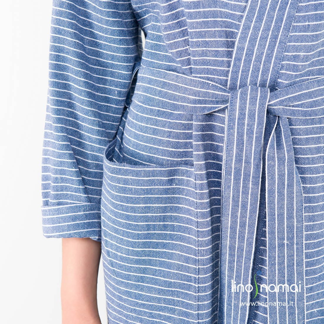 Lininis moteriškas chalatas mėlynai dryžuotas pagyvintas siauromis baltomis juostelėmis. Turi dideles kišenes priekyje ir yra surišamas plačiu diržu. Gaminio audinys skalbtas specialiu būdu - galėsite mėgautis švelniu lino ir medvilnės prisilietimu. Jei jau seniai ieškote natūralaus pluošto, puikiai sugeriančio drėgmę, greitai džiūstančio lengvo chalato, šis gaminys yra būtent tai, ko Jums reikia. Turime ir vyrišką tokio paties audinio chalatą. Įsigykite nuostabų rinkinį savo šeimai, nudžiuginkite savo antrąją pusę, apsigobkite rytais ir su gera nuotaika pradėkite dieną.