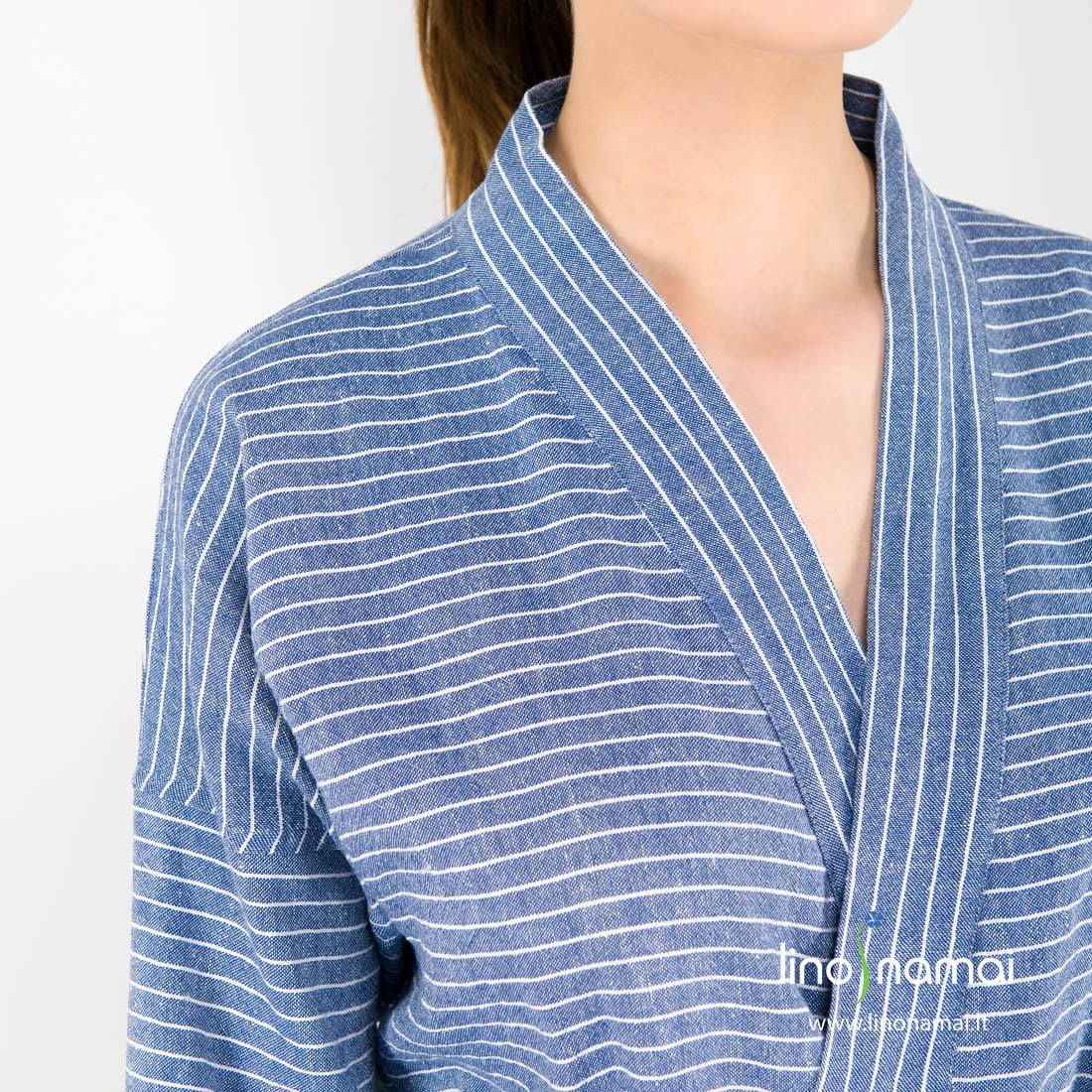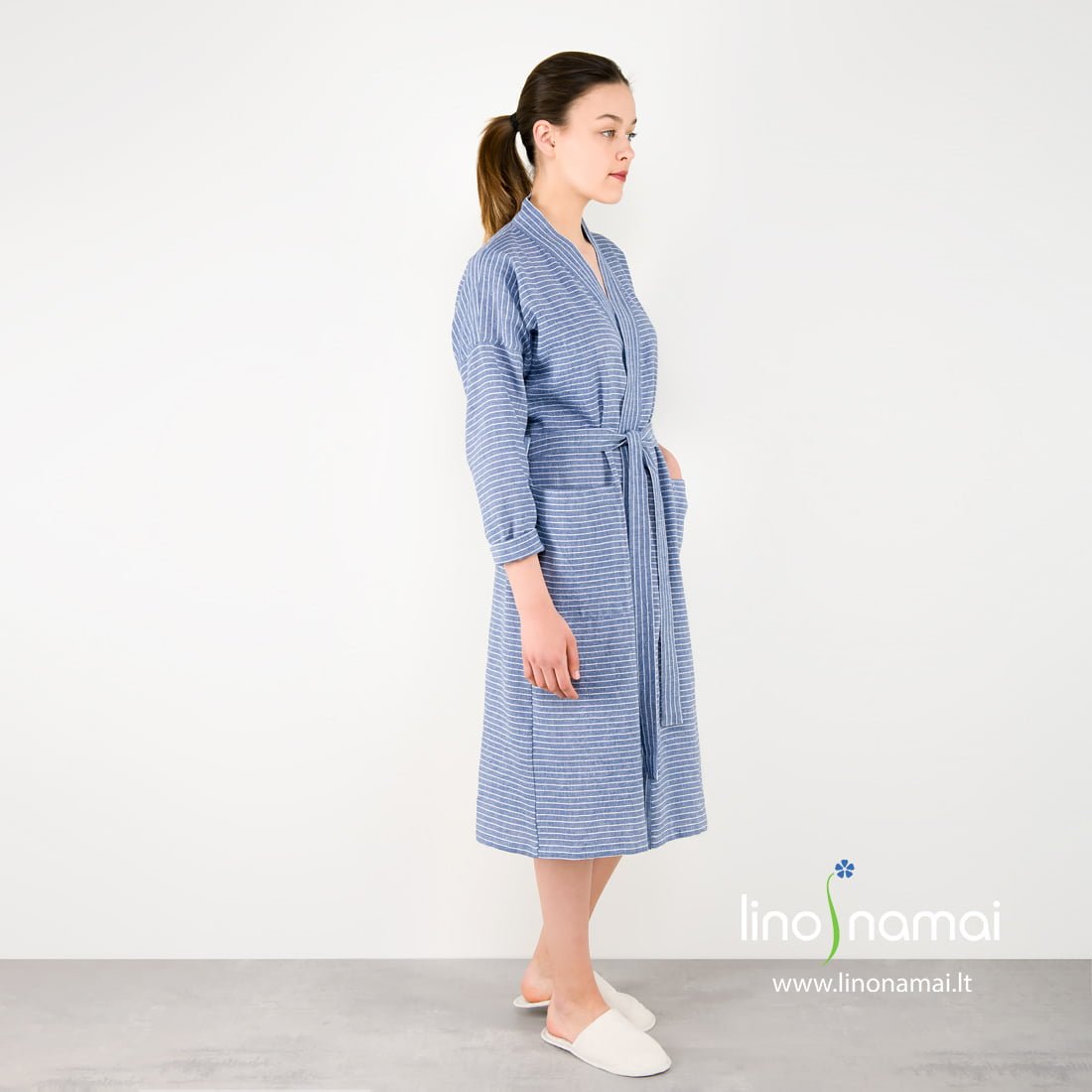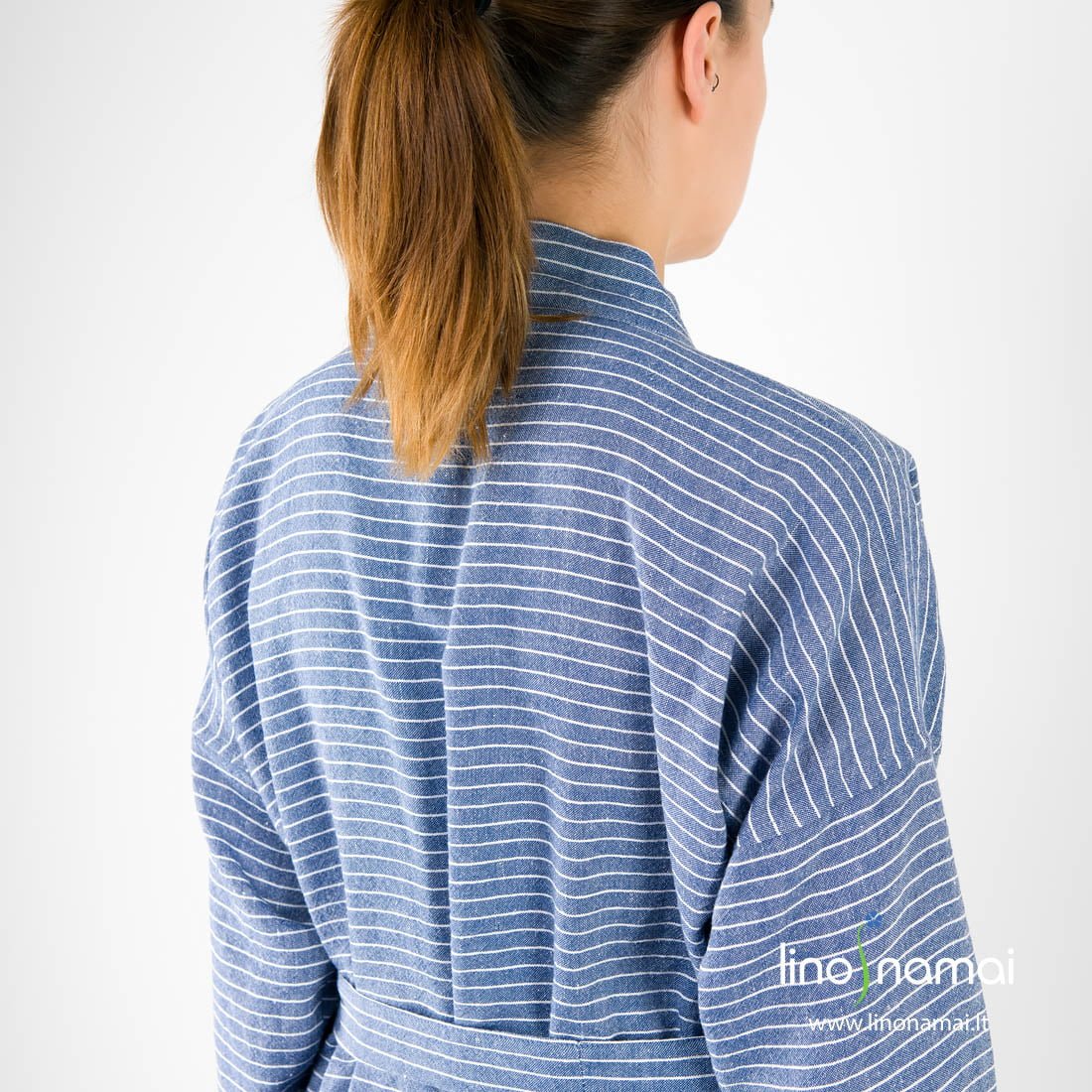 Lininis moteriškas chalatas mėlynai dryžuotas pagyvintas siauromis baltomis juostelėmis. Turi dideles kišenes priekyje ir yra surišamas plačiu diržu. Gaminio audinys skalbtas specialiu būdu - galėsite mėgautis švelniu lino ir medvilnės prisilietimu. Jei jau seniai ieškote natūralaus pluošto, puikiai sugeriančio drėgmę, greitai džiūstančio lengvo chalato, šis gaminys yra būtent tai, ko Jums reikia. Turime ir vyrišką tokio paties audinio chalatą. Įsigykite nuostabų rinkinį savo šeimai, nudžiuginkite savo antrąją pusę, apsigobkite rytais ir su gera nuotaika pradėkite dieną.