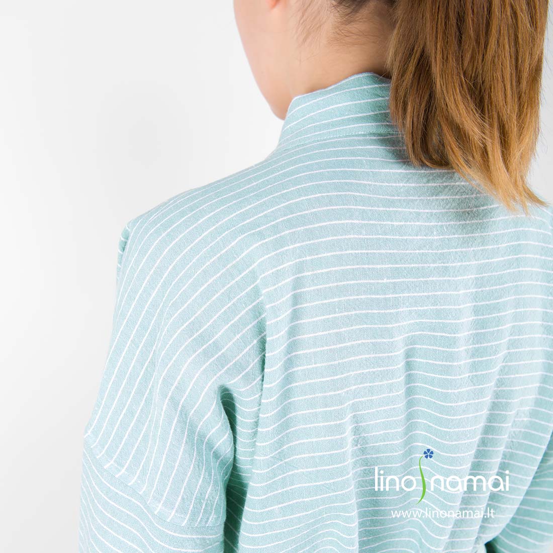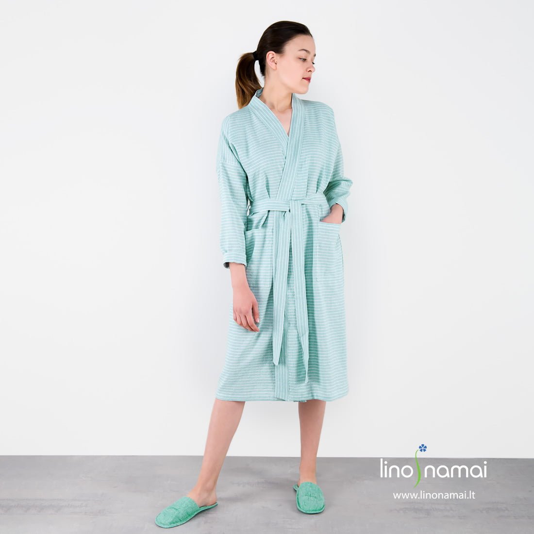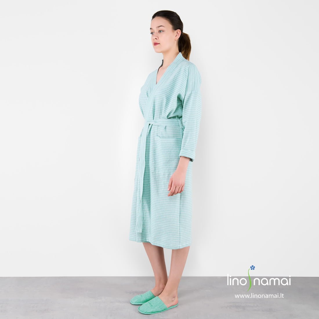 Lininis moteriškas chalatas žalsvas dryžuotas (su siauromis baltomis juostelėmis) su plačiu diržu ir didelėmis talpiomis kišenėmis priekyje. Kraštas apkantuotas plačia vertikalių dryžių juosta, kuri subtiliai kontrastuoja su šalia esančiomis horizontaliomis juostelėmis. Gaminys pasiūtas iš specialiu būdu skalbto lengvo lino-medvilnės audinio: malonus dėvėti, puikiai sugeriantis drėgmę, greitai džiūstantis, neužimantis daug vietos lagamine ar skalbimo mašinoje. Puikus pasirinkimas, jei ieškote minkšto lengvo drabužio maloniems ryto ritualams.