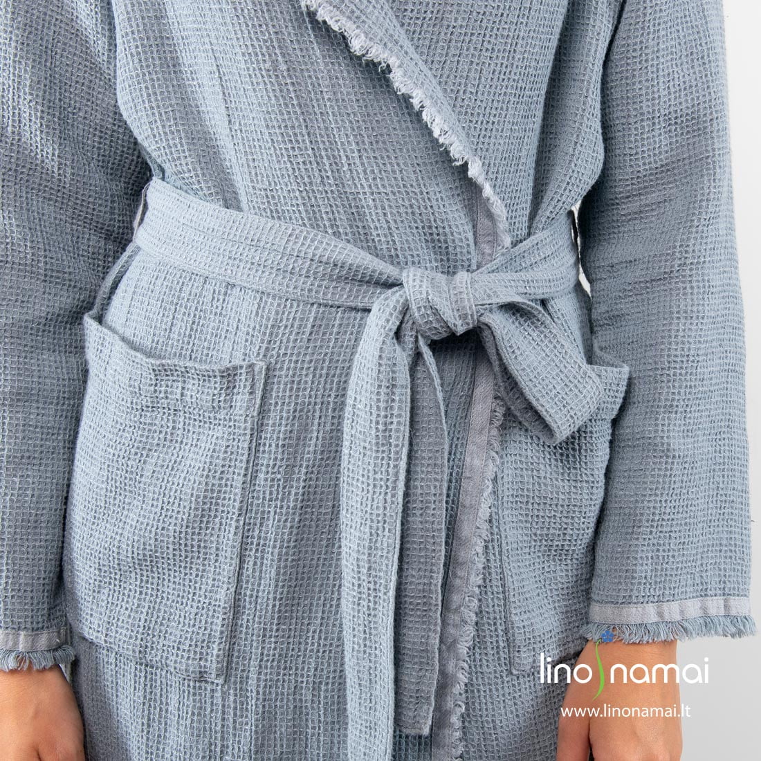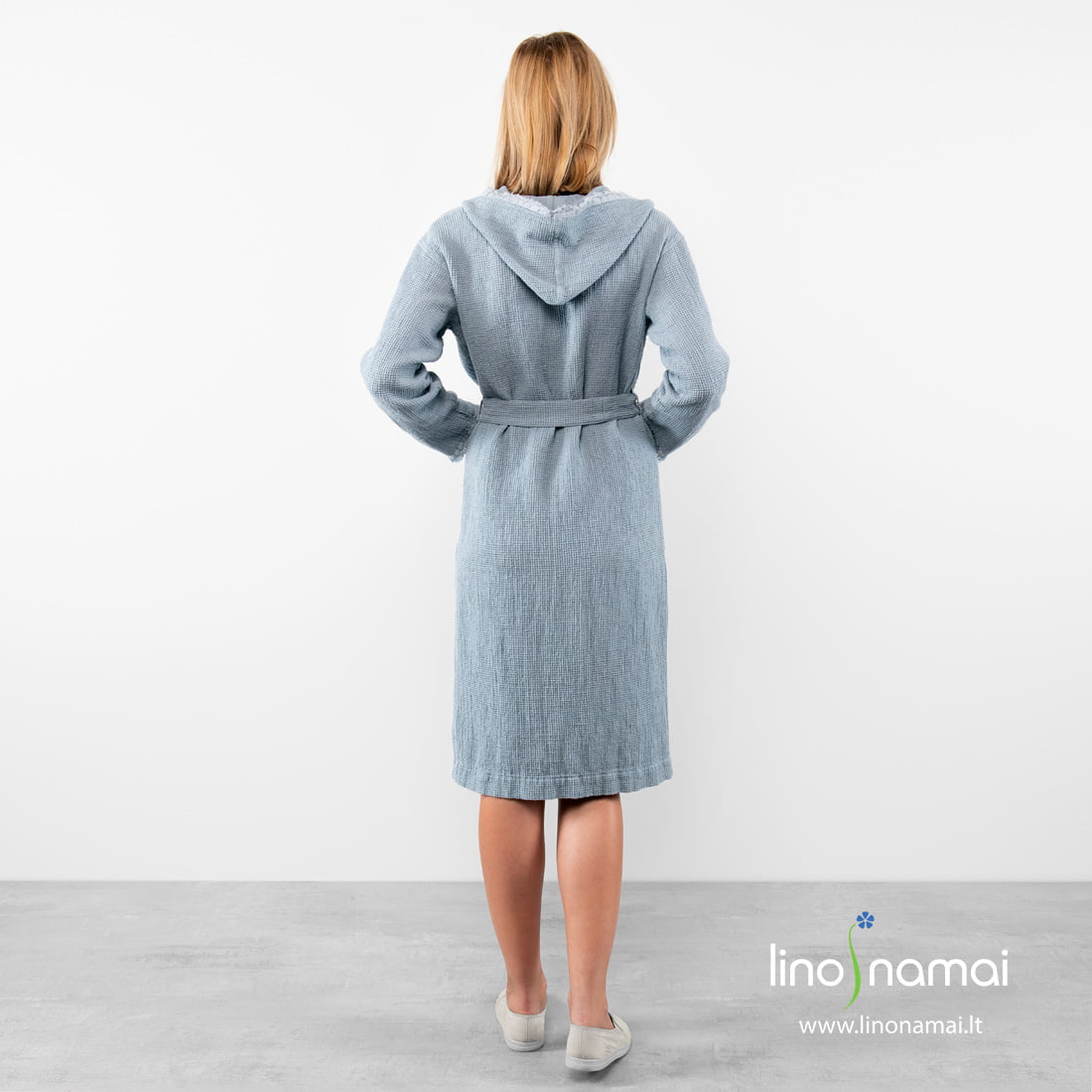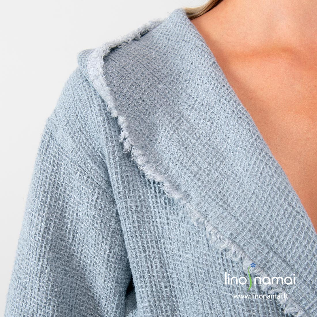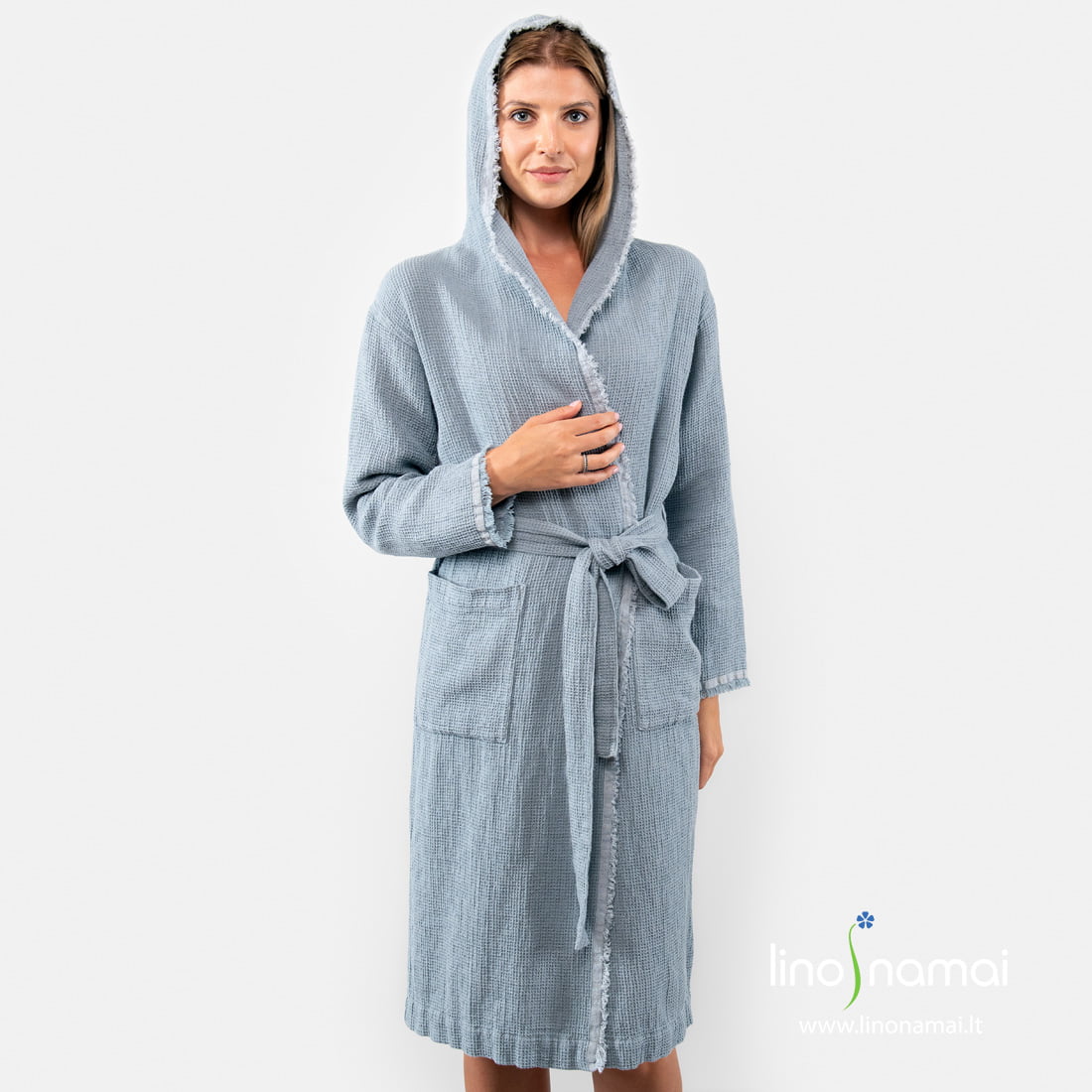 Puslininis moteriškas melsvas chalatas su kutais pasiūtas iš minkšto, švelnaus, puraus, specialiu būdu skalbto „vaflinio“ lino - medvilnės sudėties audinio. Drabužio pakraštys ir rankogaliai puošti lygaus audimo juostele ir trumpais pešiotais kutais. Su gobtuvu, surišamas plačiu diržu, su didelėmis kišenėmis priekyje. Lengvo audinio chalatas - nuostabus pasirinkimas šiltam sezonui!