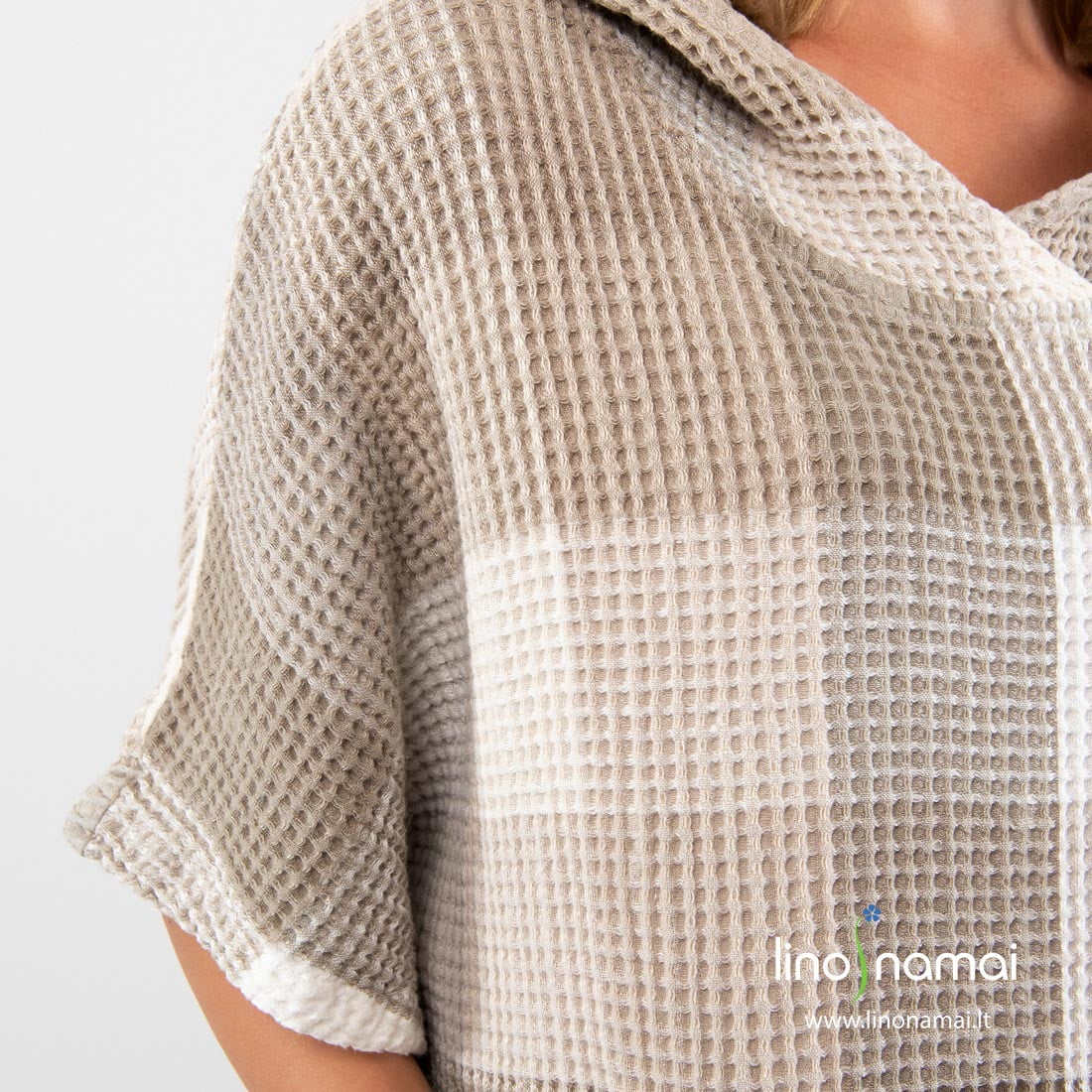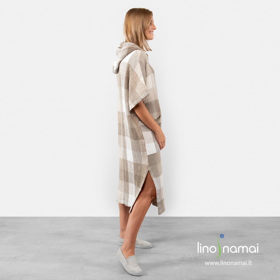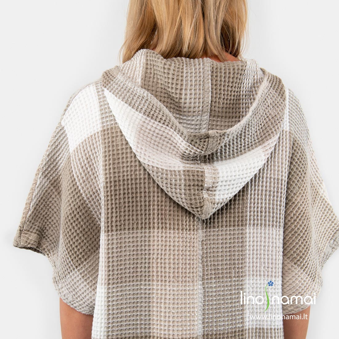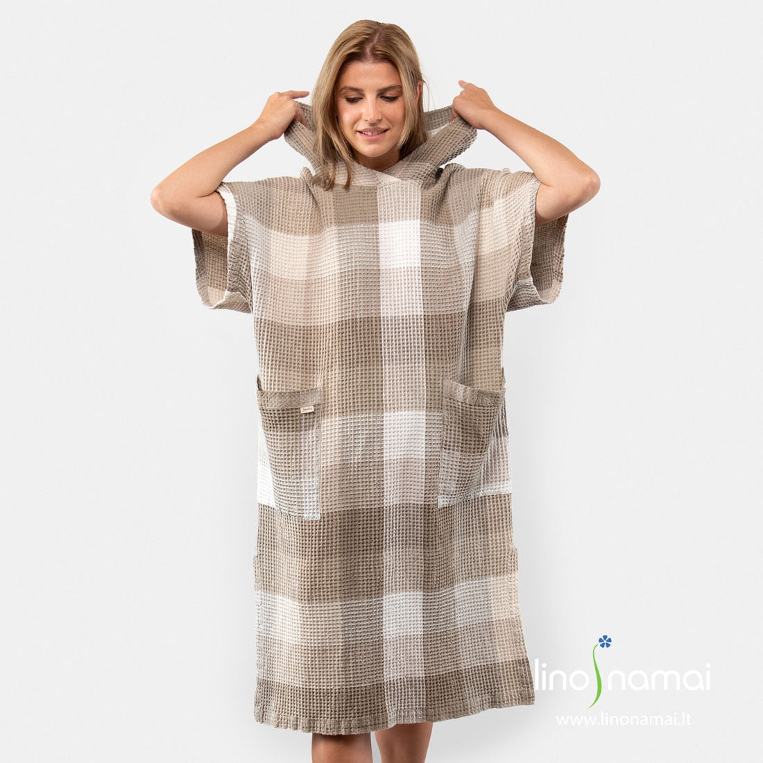 Puslininis pilkai languotas pončas, pasiūtas iš rusvai pilkais ir pieno baltumo verpalais „vafliniu“ raštu austo audinio. Po specialaus skalbimo šis gaminys tapo minkštas, švelnus, malonus kūnui. Pončas su gobtuvu, kišenėmis, skeltukais šonuose, trumpomis rankovėmis. Pasiuvome šį gaminį dviejų dydžių: jam ir jai. Kai norisi pasislėpti nuo saulės ar nusausinti kūną, šis pončas tam ypač tinka. Įsigykite ir būtinai pasiimkite vykdami prie jūros!