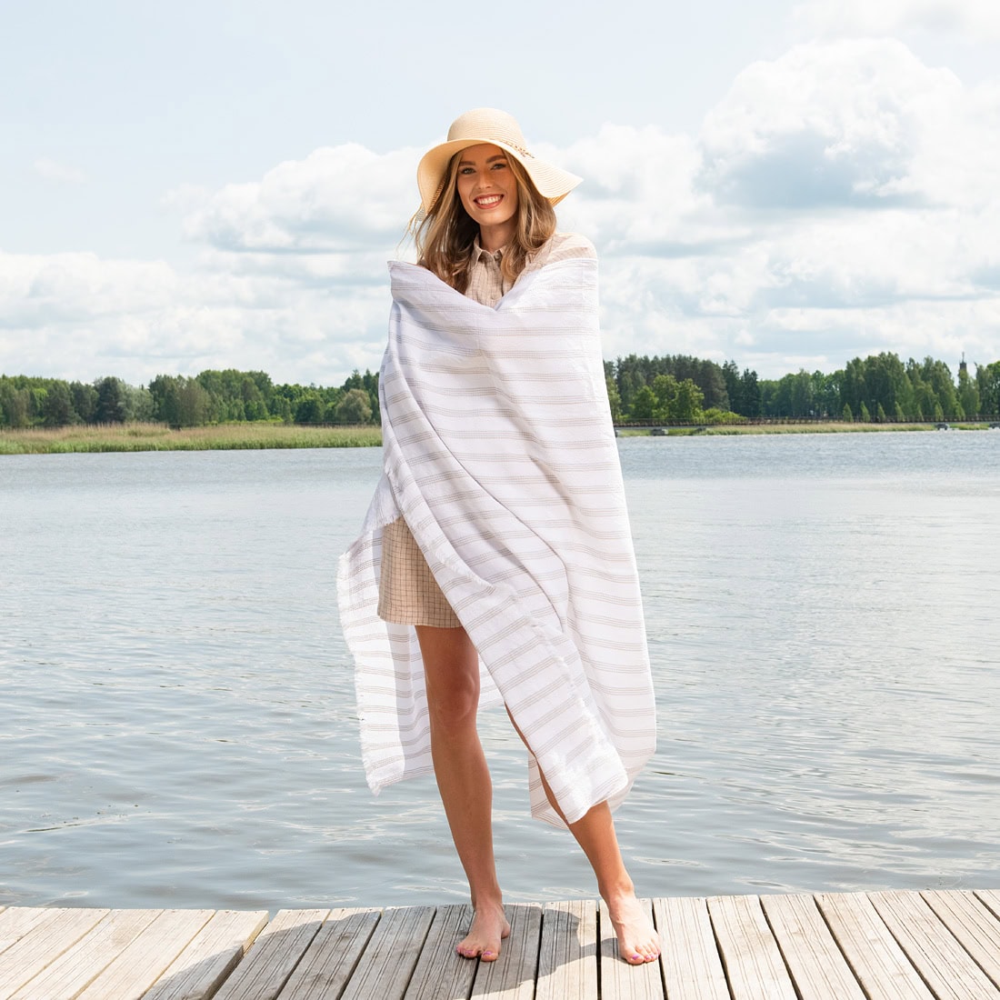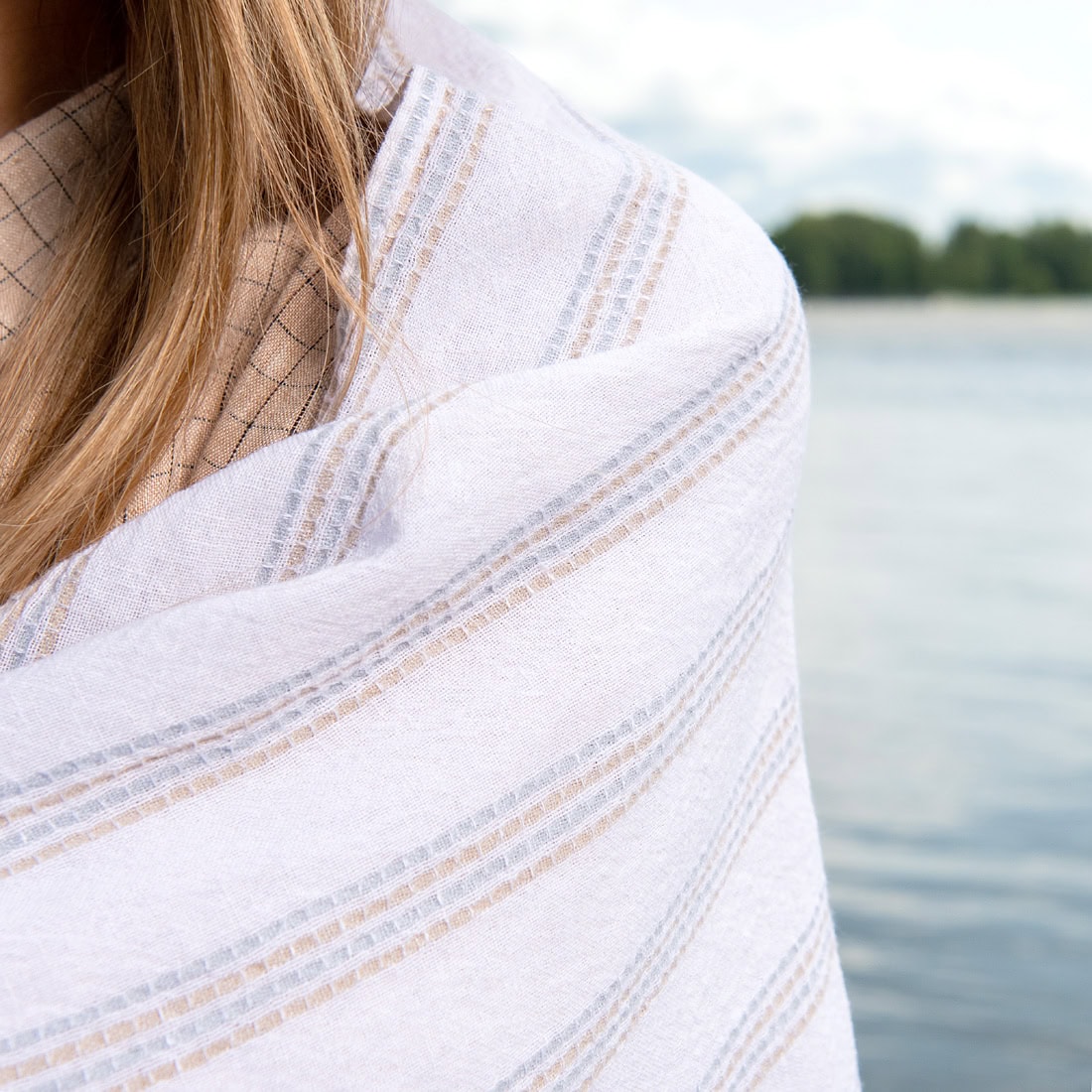 Baltas lino - medvilnės paplūdimio rankšluostis rusvai pilkai, žalsvai dryžuotas, puoštas 2cm ilgio pešiotais kutais trumposiose kraštinėse. Pasiūtas iš lengvo, minkšto, specialiu būdu skalbto audinio. Galima naudoti pasitiesti paplūdimyje, iškylose, kaip uždangą nuo saulės ar vėjo, švelniai susisupti, šluostytis. Šis natūralaus pluošto rankšluostis - nepakeičiamas vasaros ir smagių nuotykių palydovas!