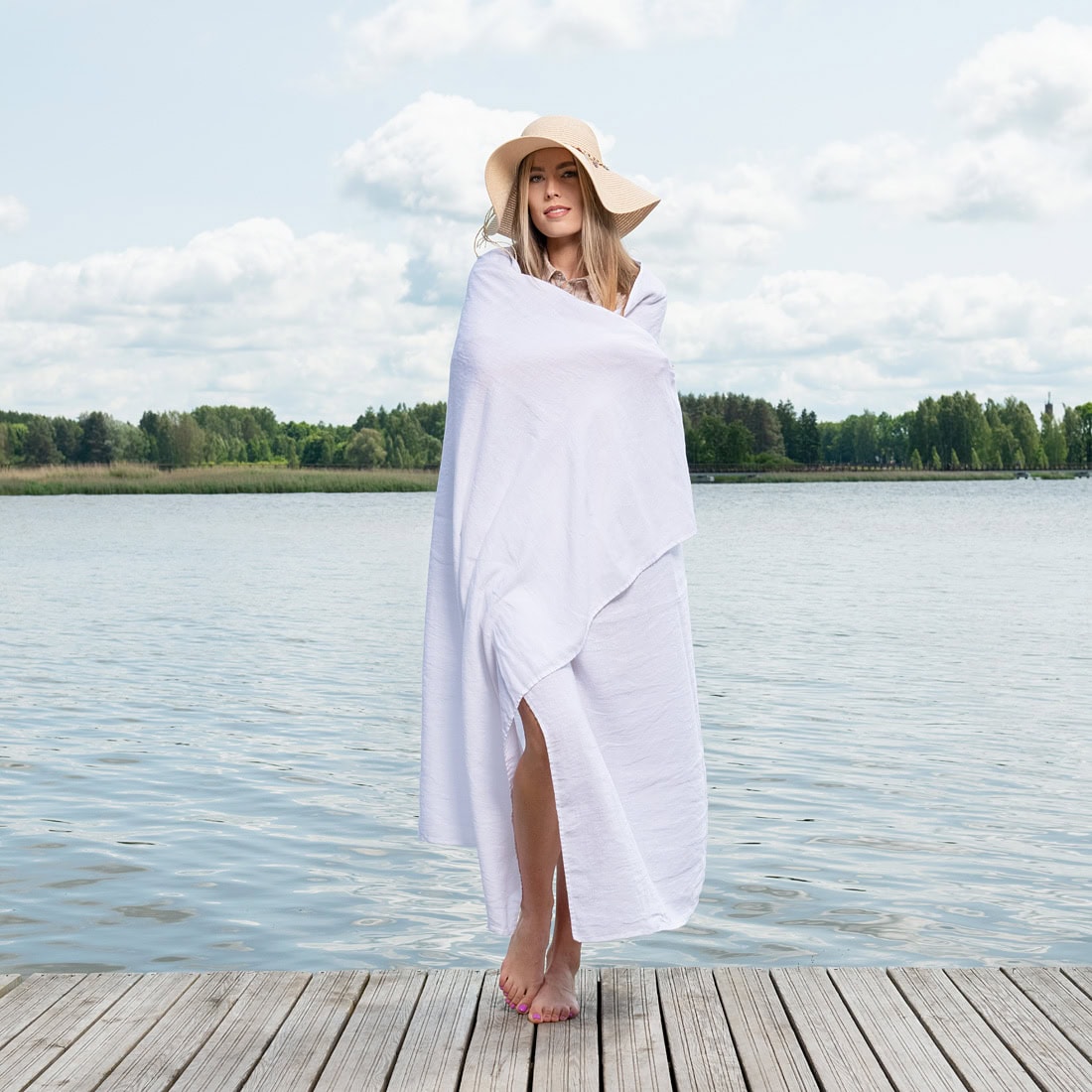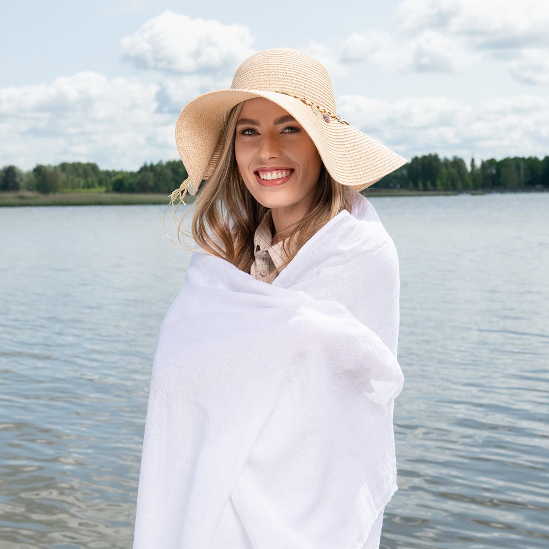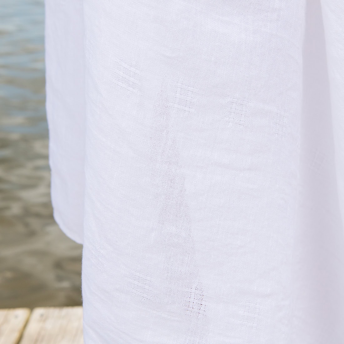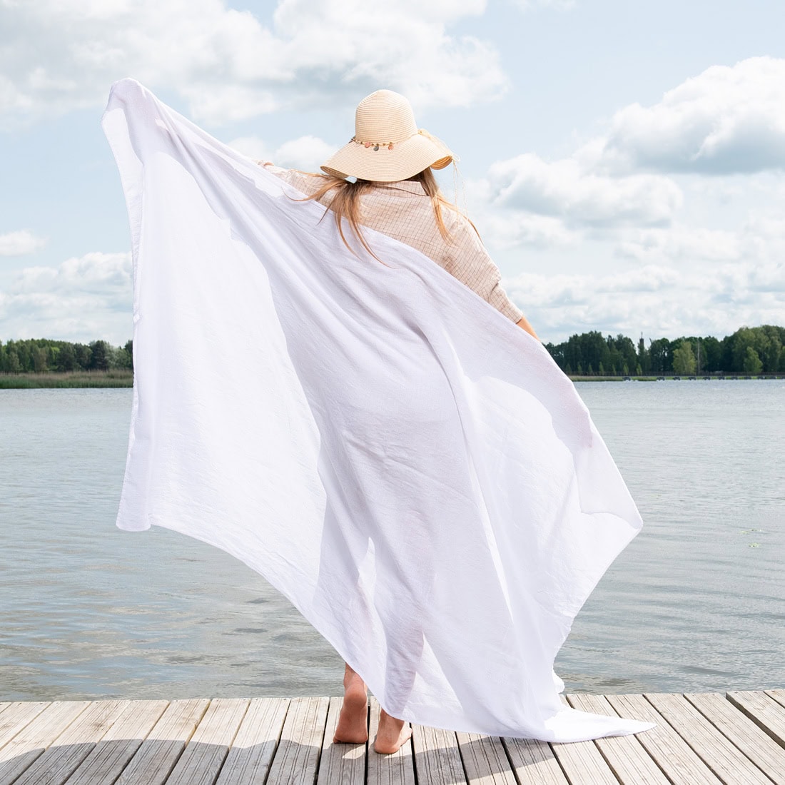 Ryškiai baltas puslininis (lino - medvilnės sudėties) paplūdimio rankšluostis su ažūriniais langeliais krašte. Dėl audinio lengvumo ir dekoratyvumo šį rankšluostį galite naudoti ir kaip skraistę, saulės nurusvintiems, vėjo nugairintiems pečiams apgaubti. Švelnus, minkštas specialiai skalbtas audinys maloniai lies odą, nedirgins jos. Įsigykite ir neužmirškite vykdami prie jūros!
