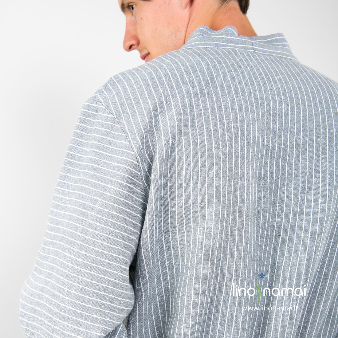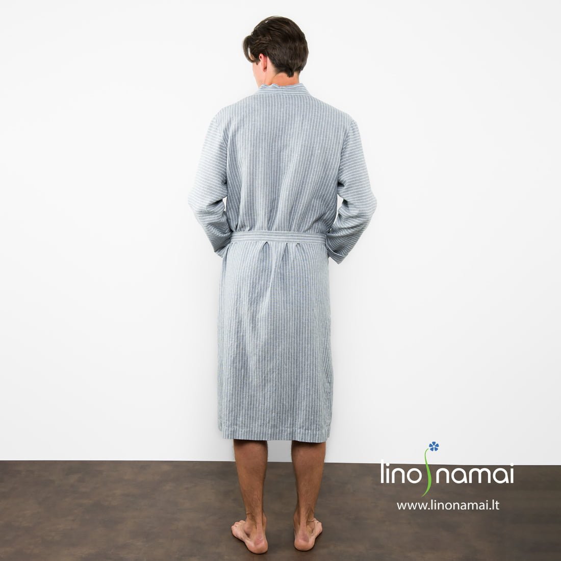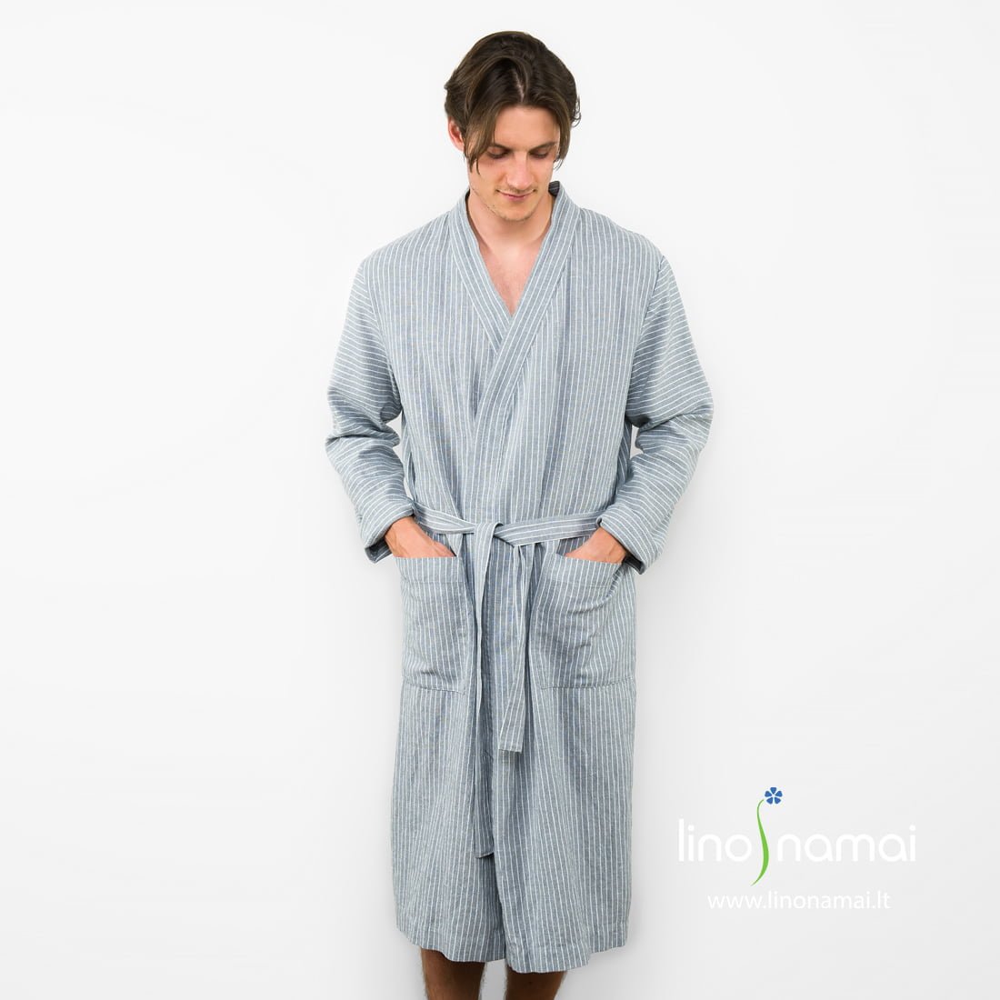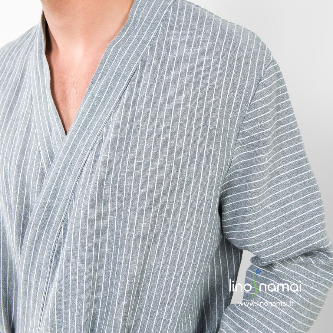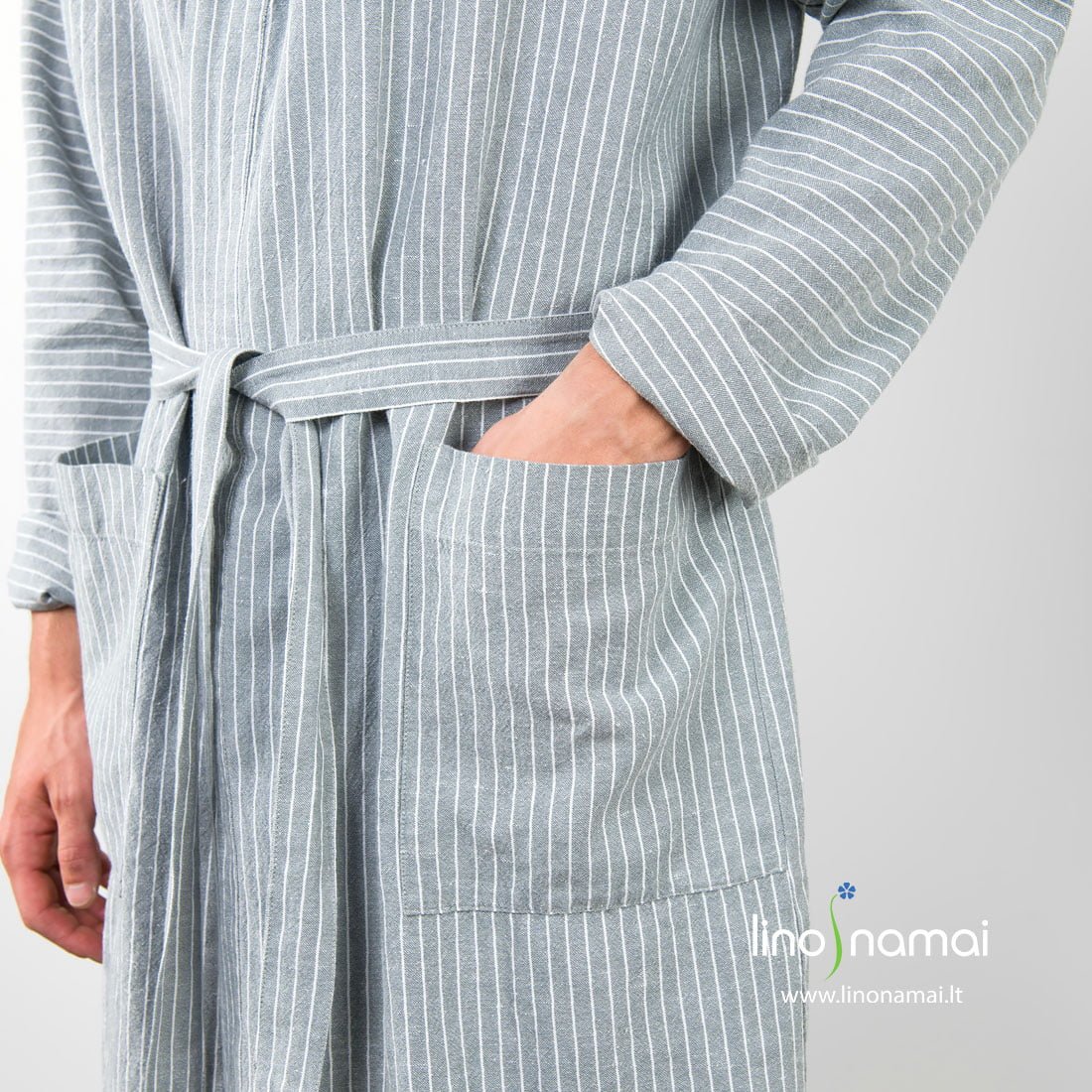 Lininis vyriškas chalatas pilkai dryžuotas (pilkame lino - medvilnės audinio fone išaustos siauros baltos spalvos juostelės). Susiaučiamas, surišamas diržu, su didelėmis kišenėmis priekyje. Gaminio audinį prieš siuvimą išskalbėme specialia technologija, todėl jis minkštas, švelnus, malonus odai. Šis lengvas chalatas labiausiai tinka kelionėms ir vasarai, kai storų chalatų nesinori, kai reikia chalato, kuris kuo mažiau vietos užimtų lagamine ar kelioniniame krepšyje.