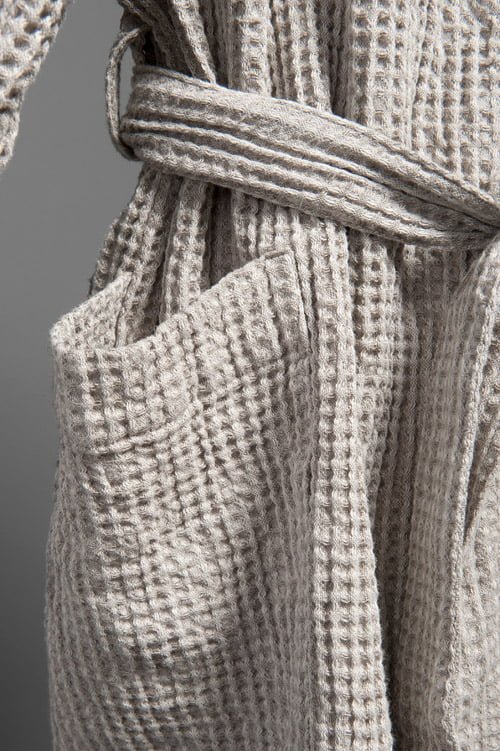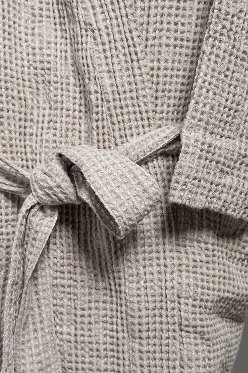 Vyriškas pilkas chalatas su dvejomis kišenėmis, ties liemeniu surišamas diržu. Ypatingas lino / medvilnės audinys buvo specialiai skalbtas ir austas stambiu korėtu raštu, kuris suteikia gaminiui ypatingo minkštumo, purumo, o apsivilkus po maudynių maloniai sušildo ir gerai sugeria drėgmę nuo kūno. Suteikite sau malonumą atsipalaiduoti įsisupus į šį nuostabų chalatą arba padovanokite šią galimybę kitiems. Galima derinti kartu su tokio pat audinio vaikišku ar moterišku chalatu.